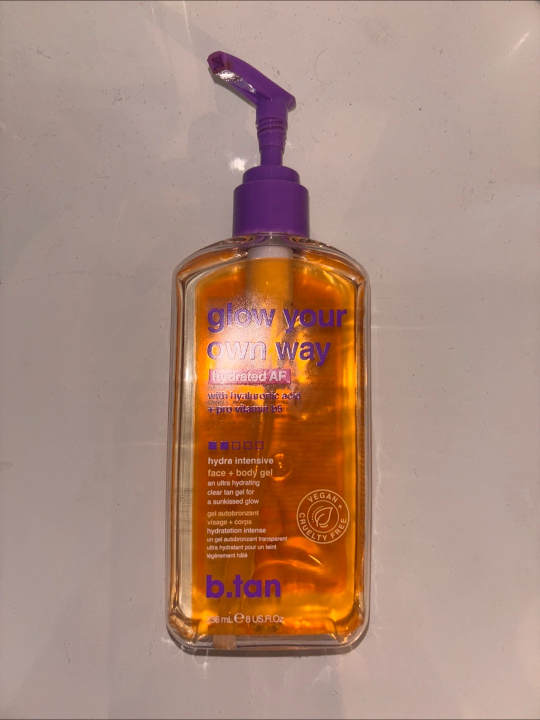 Selling a bottle of b.tan glow your own way hydrating AF. It's a hydra intensive face and body gel for a sun-kissed glow! It also contains hyaluronic acid and pro vitamin B5.