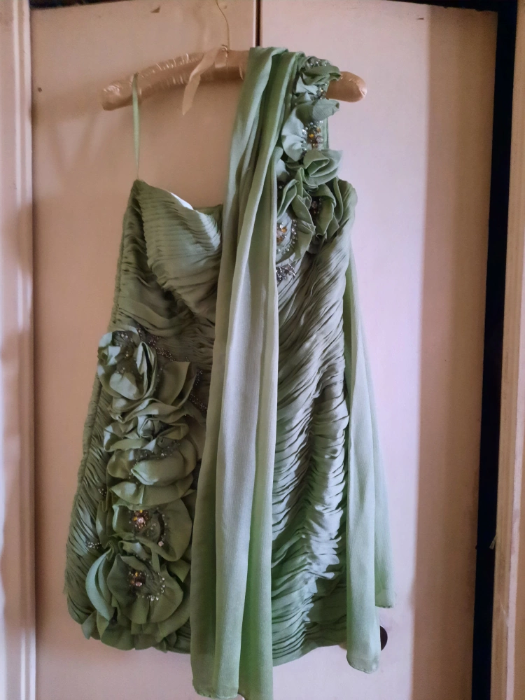 Selling a lovely green, one-shoulder dress. It features beautiful floral detailing and a unique design. Perfect for a special occasion!