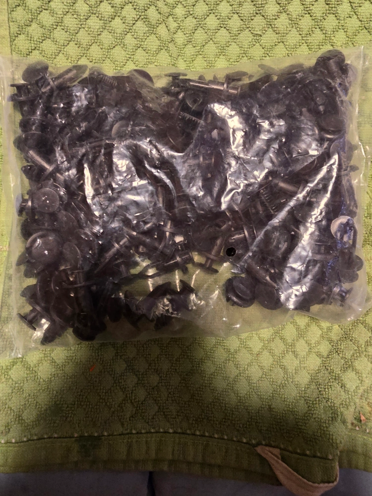 I have a bag of black push retainer clips for sale! They look to be in good condition and ready for use. Perfect for various automotive and general fastening needs