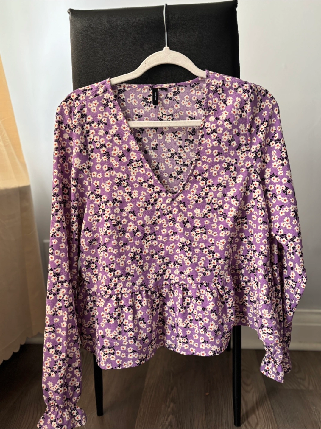 A cute purple floral medium blouse ! It features a v-neck and long sleeves with ruffled cuffs. Perfect for adding a touch of spring to your wardrobe