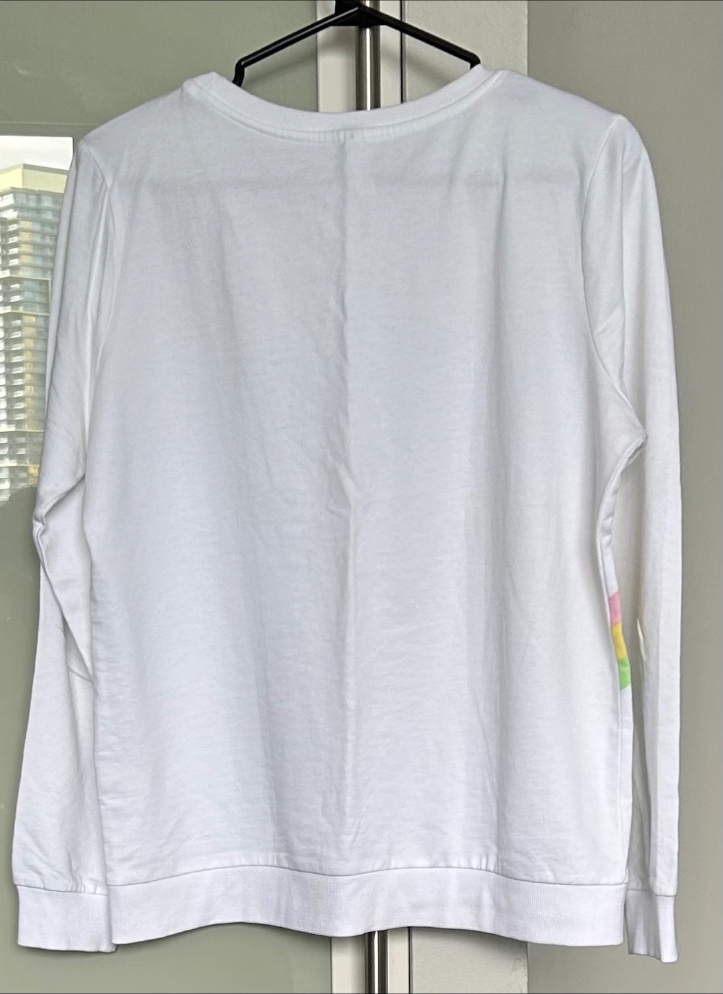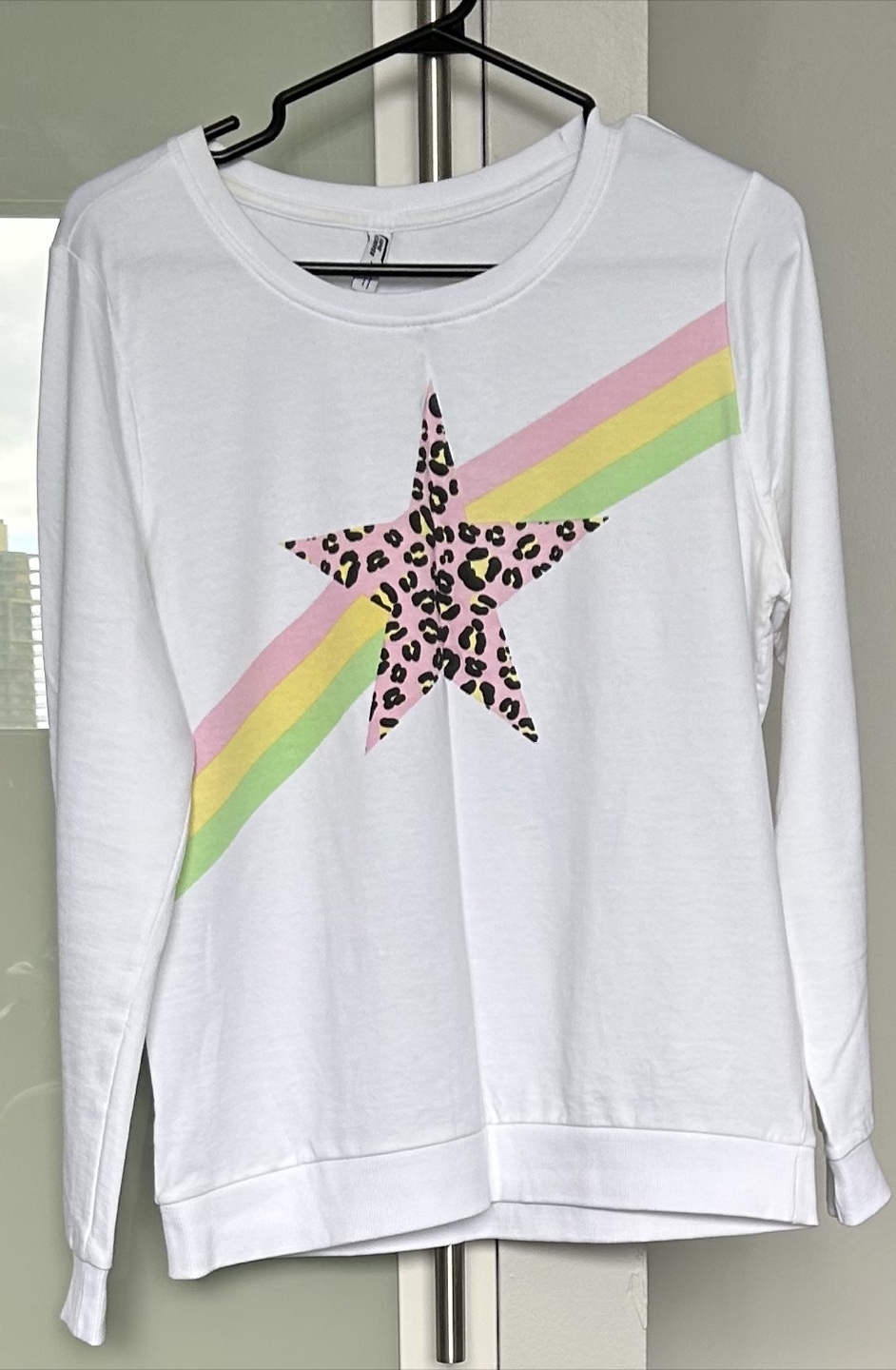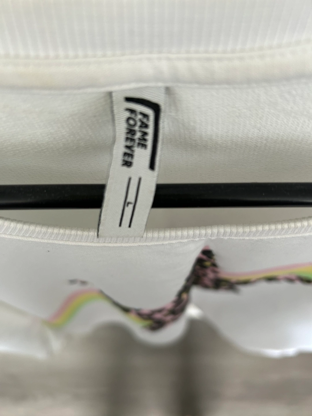 Selling a cute Fame Forever white long-sleeve top! It features a fun star design with a colourful stripe. It's in great condition and a size large.