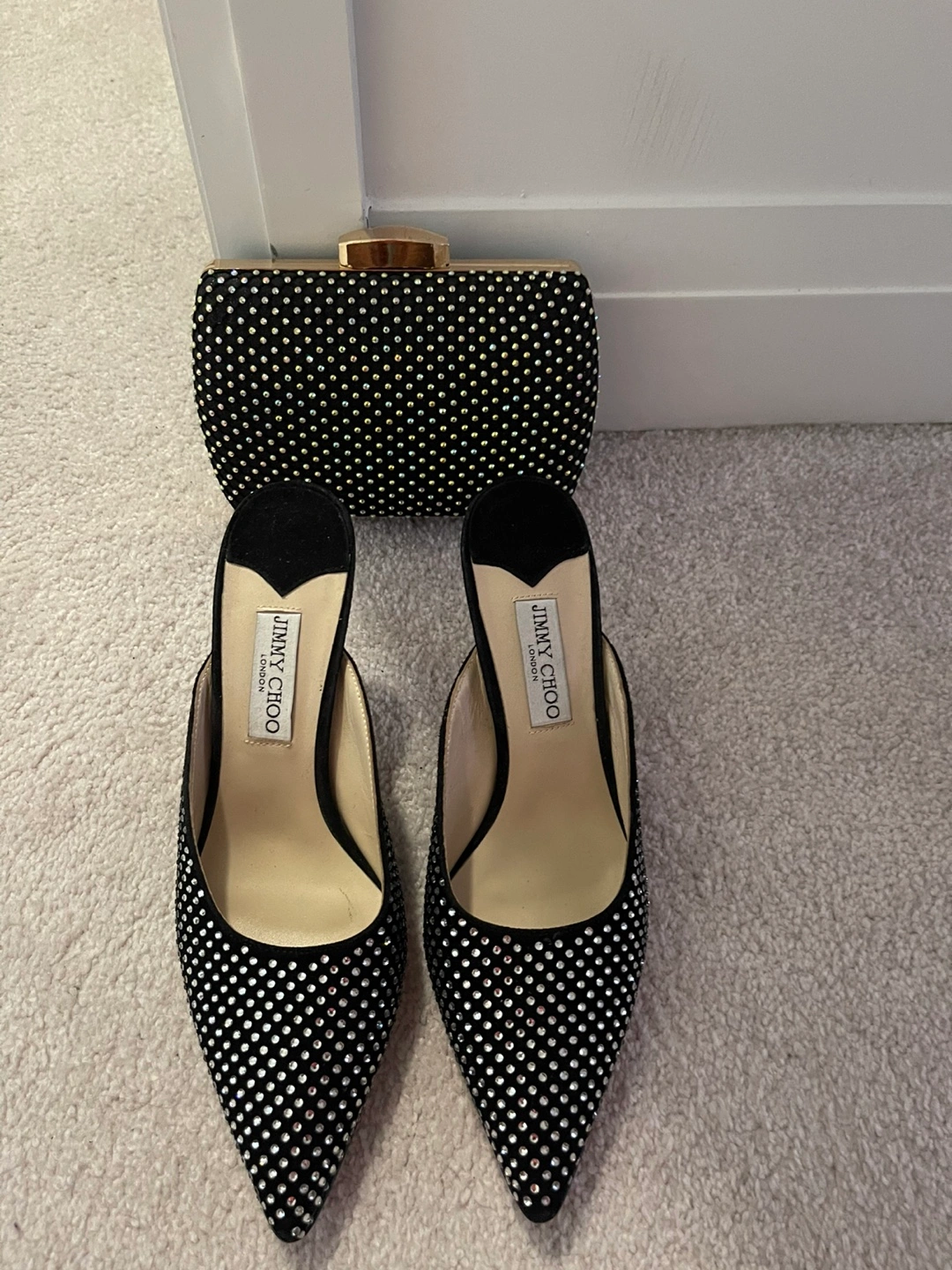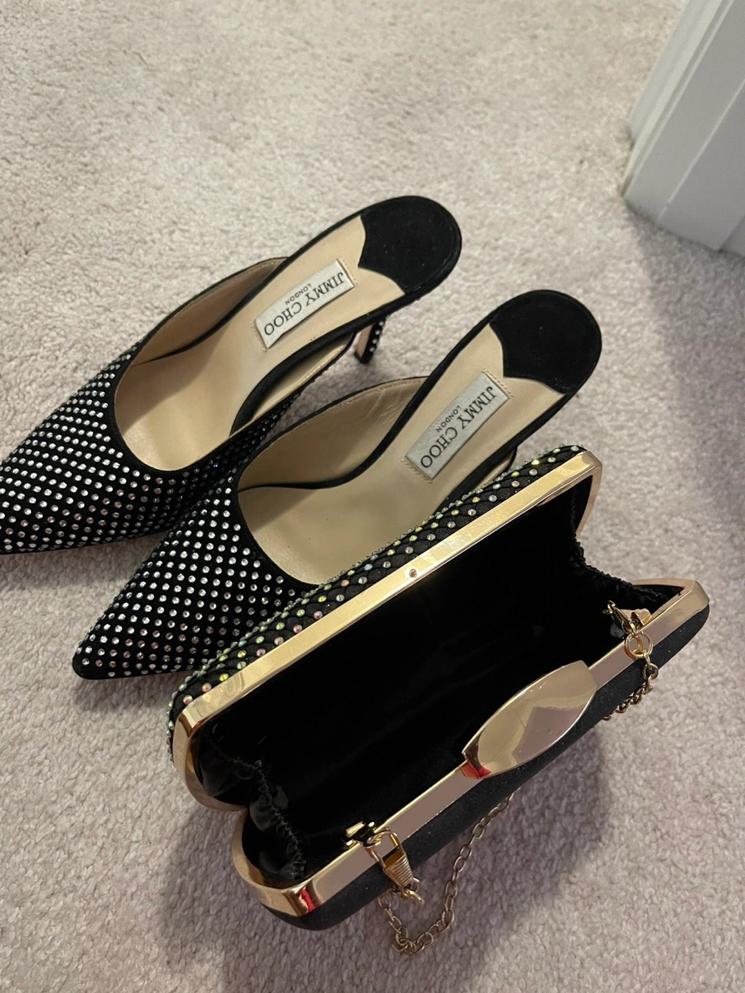 Selling a gorgeous Jimmy Choo clutch and heels set! Both are in excellent condition and feature a stunning, sparkly design. The clutch is perfect for evenings out, and the heels will add a touch of glamour to any outfit. Don't miss out on this stylish combo!