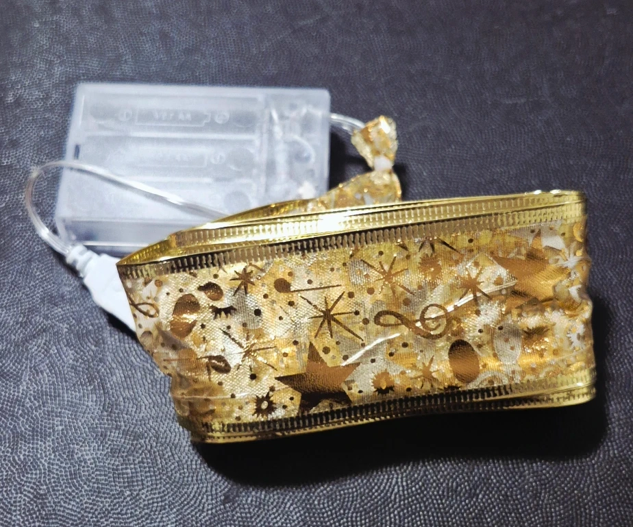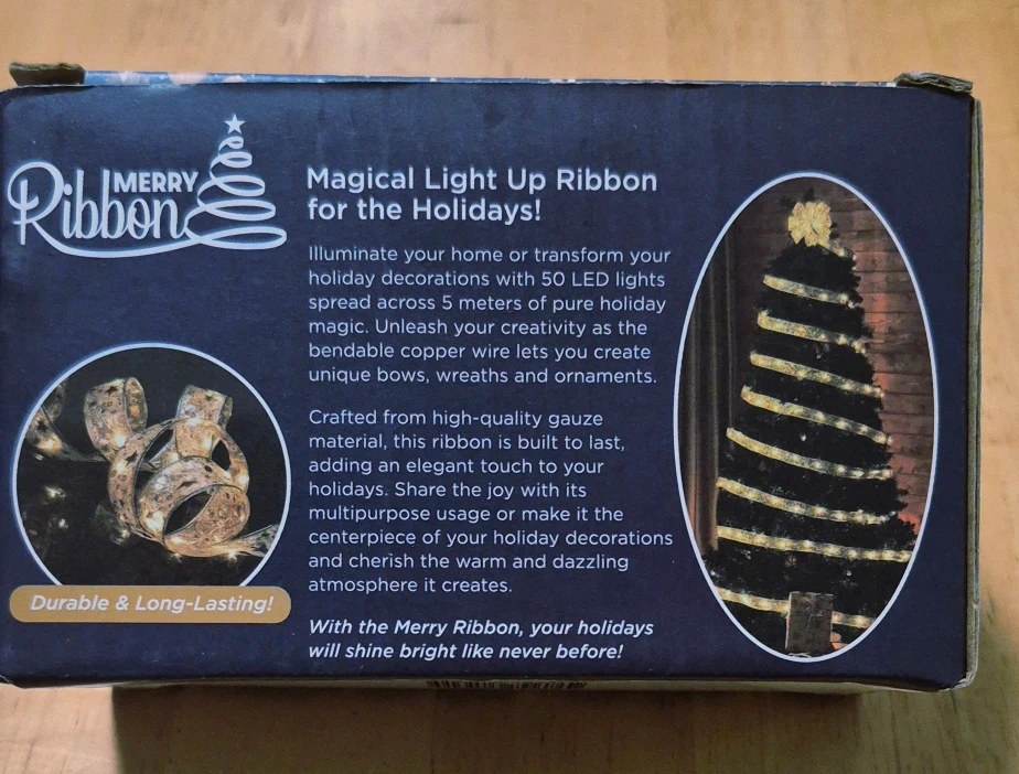 Selling a brand new Merry Ribbon Magical Light Up Ribbon for the holidays! It's perfect for DIY projects and lighting up your holidays. The ribbon has 50 LED lights and is flexible with an on/off switch. It can be powered by battery or USB. Durable and long-lasting!