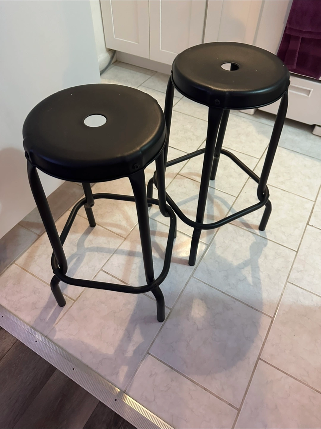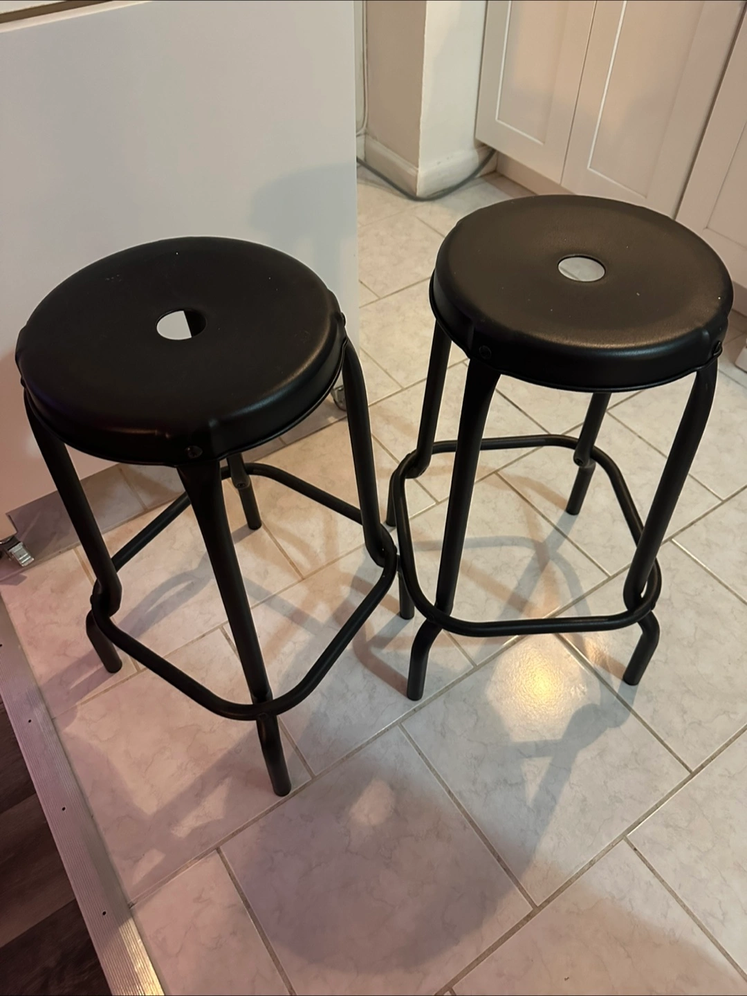 60Selling a set of two bar stools, perfect for your kitchen island or bar area! They are black metal and in good condition. These stools are sturdy and stylish, adding a modern touch to any space