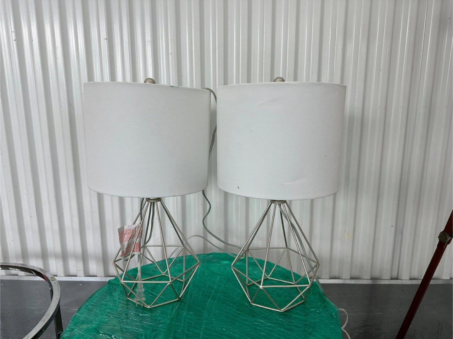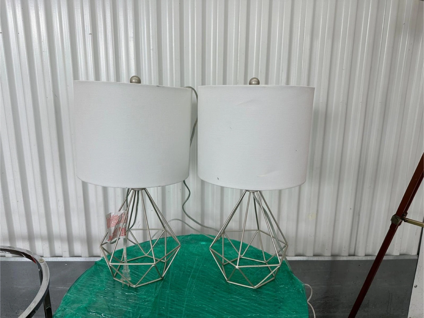 Selling a set of two lamps! They have a white shade and a geometric silver base. They would look great in any room!