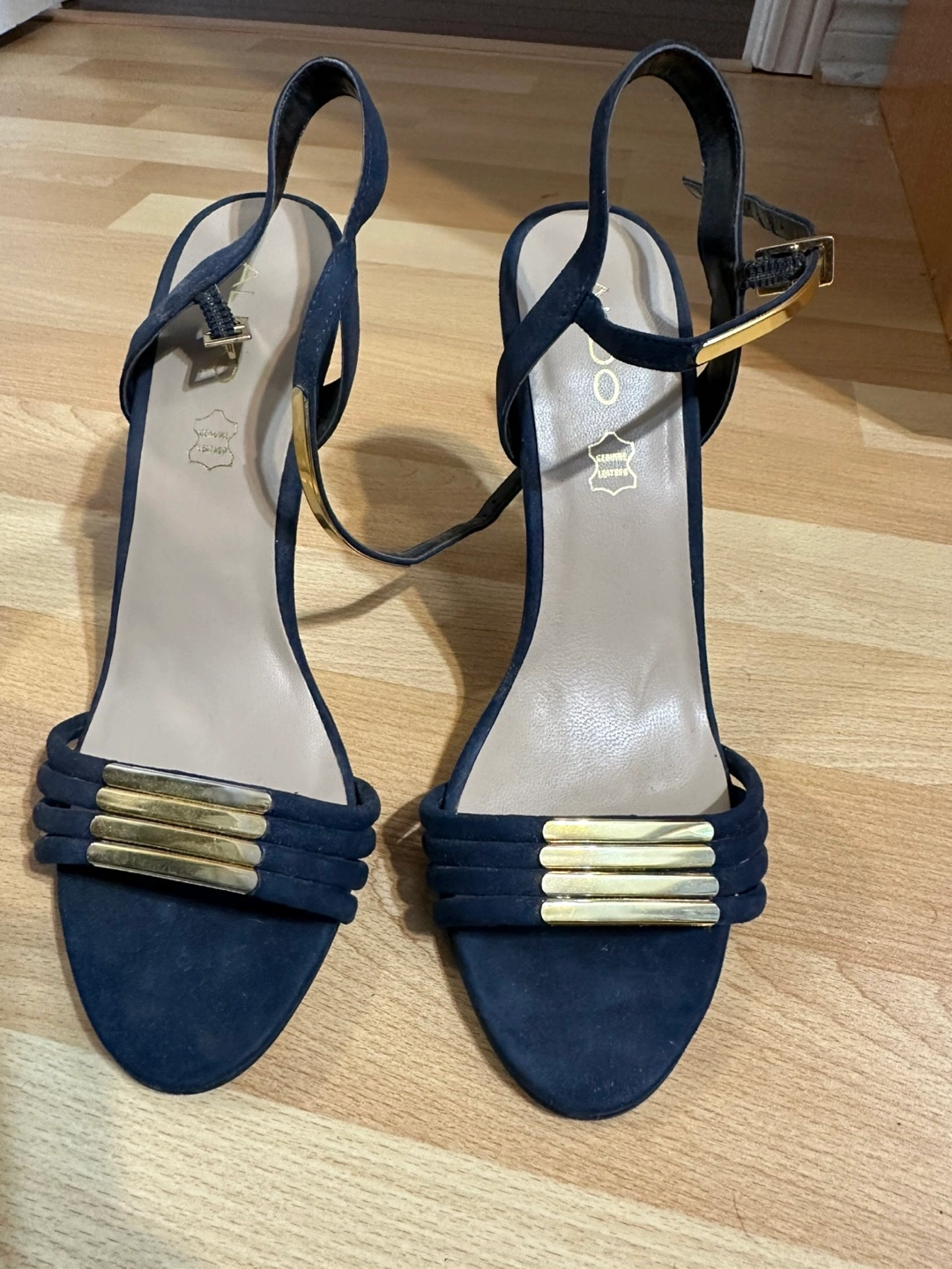 Selling a pair of ALDO women's heels in size 9. They're a stylish navy blue with gold accents. Perfect for dressing up any outfit!