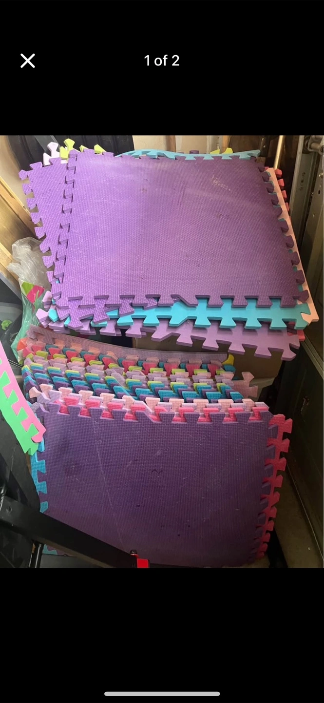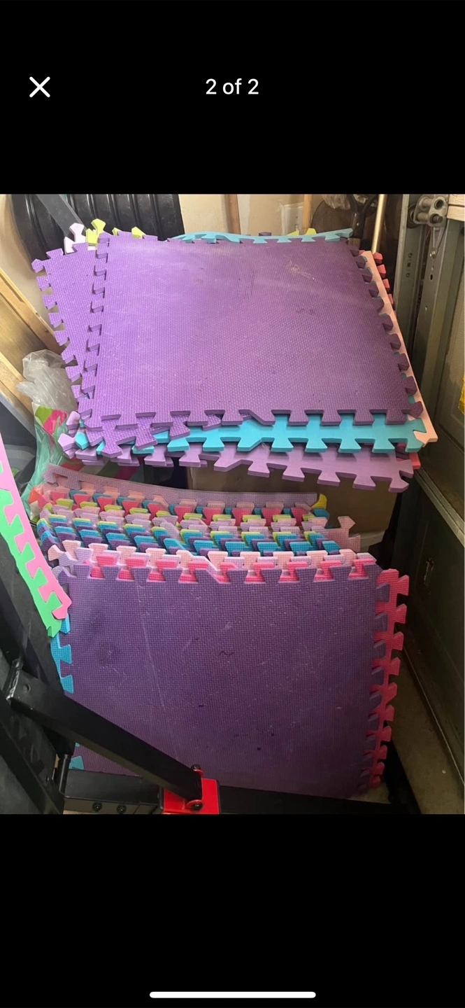 Selling a set of kids' foam play mats! They're in great condition and perfect for creating a soft and safe play area. The mats are colourful with purple, pink, and blue pieces.