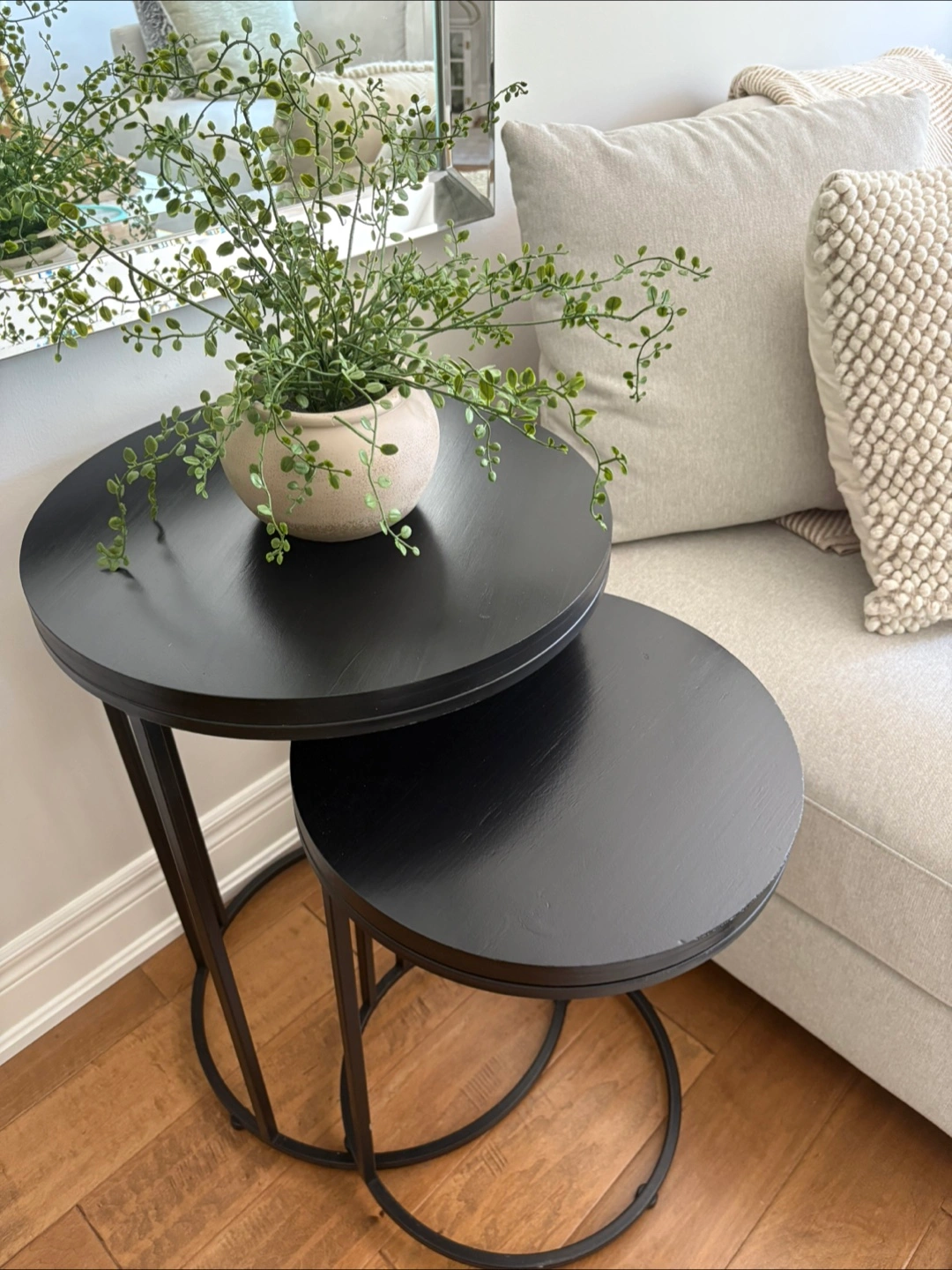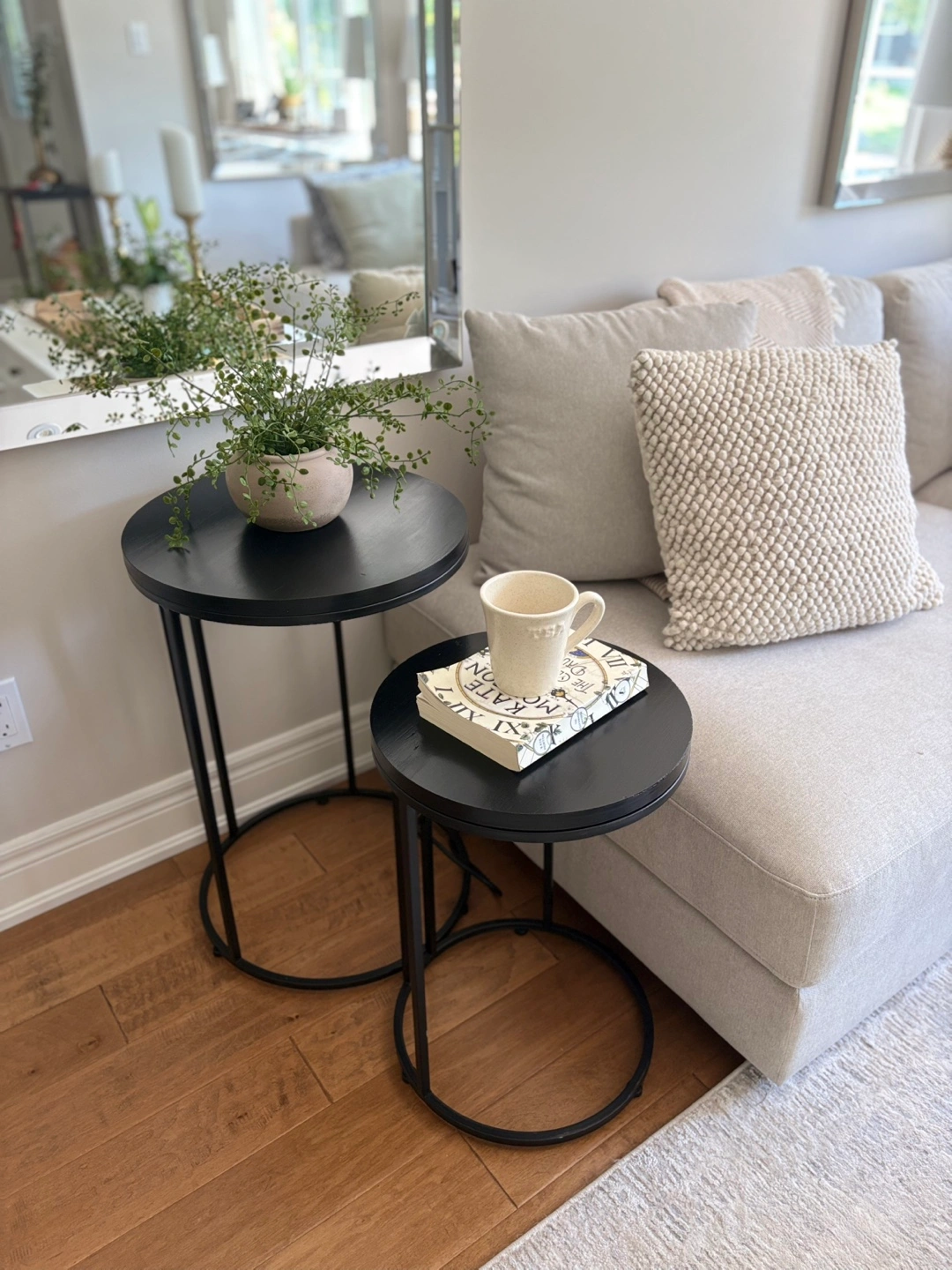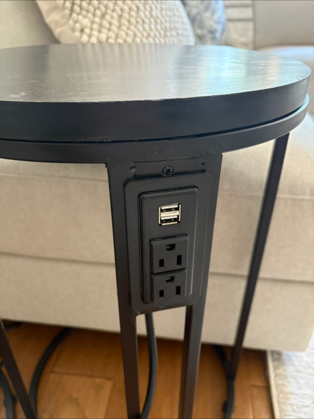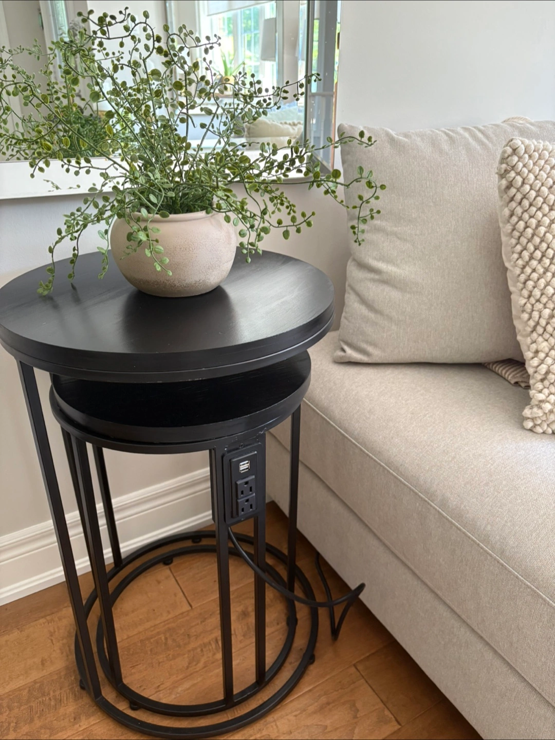 Two black faux-wood topped, metal legged round nesting tables, the smaller of the two has a power bar attached that features 2 USB ports and 2 standard outlets.