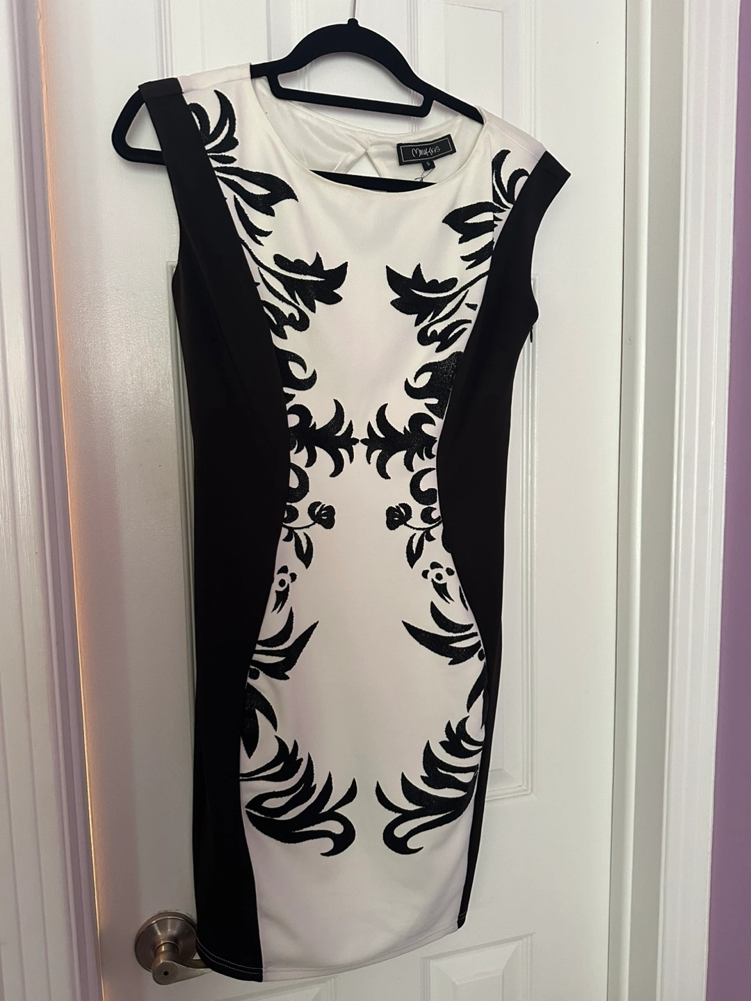 Here's a Minkas dress in size S but stretchable fits Medium size as well It's black and white, with a unique design. Perfect for a night out or a special occasion!