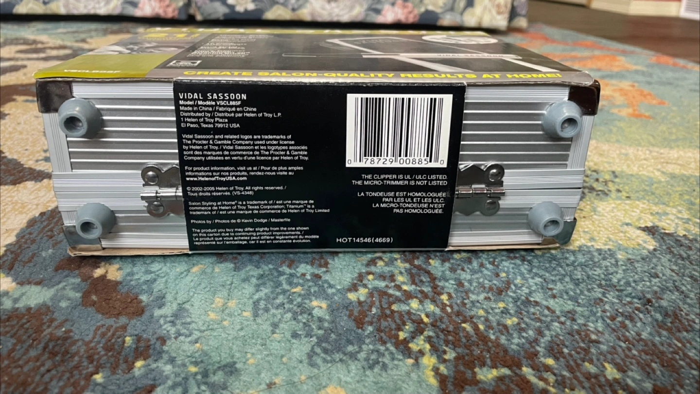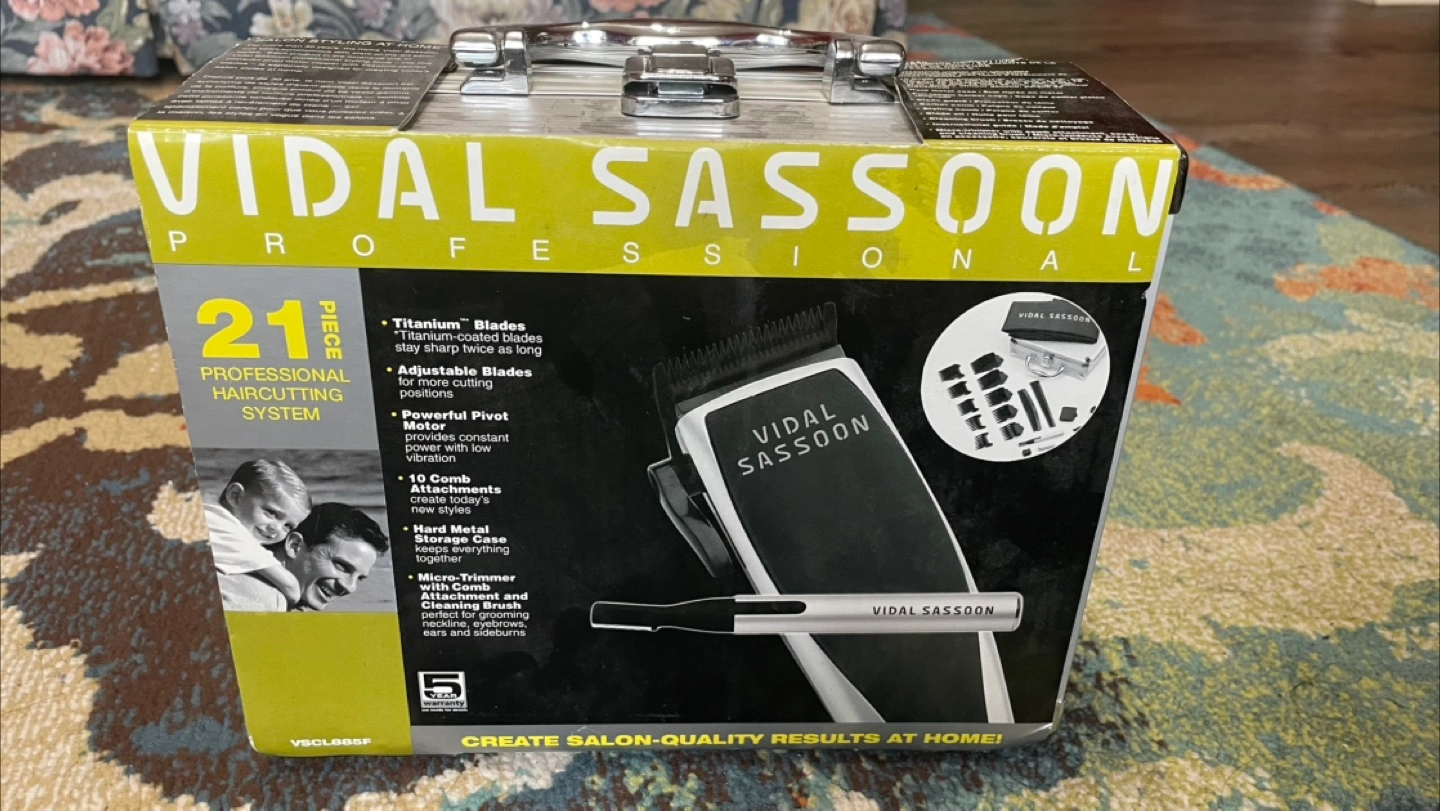 Vidal Sassoon hair cutting kit β Model VSCL885F. Used and in working condition. Comes with original metal case and cardboard packaging.
