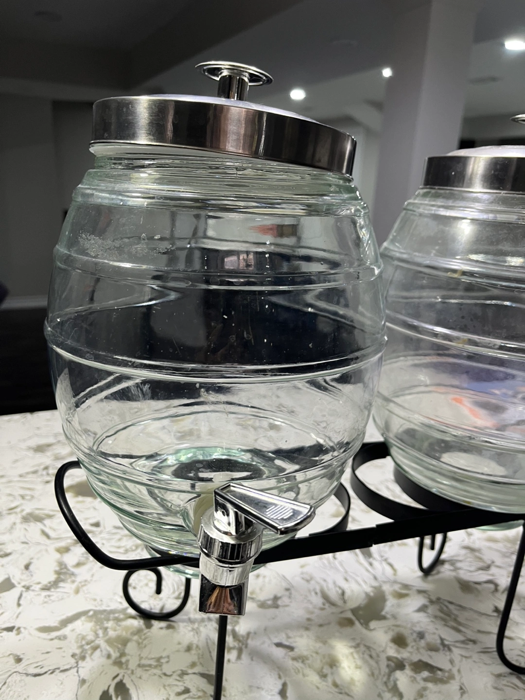 Also included are two drink dispensers with a black metal stand