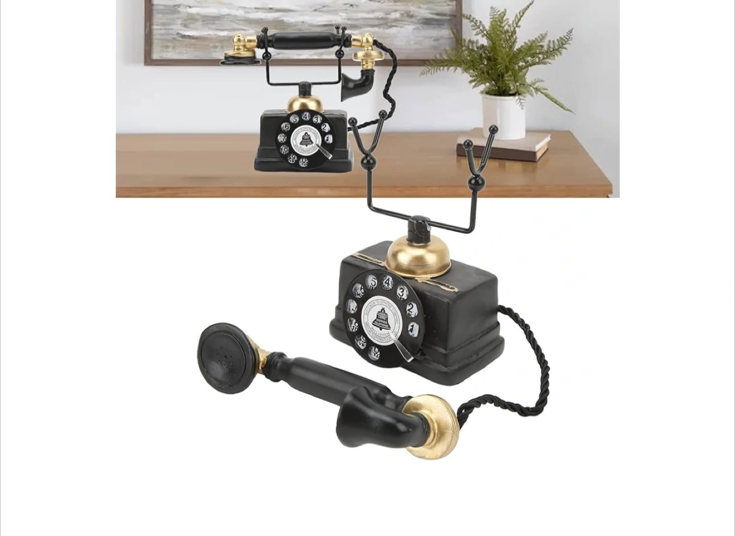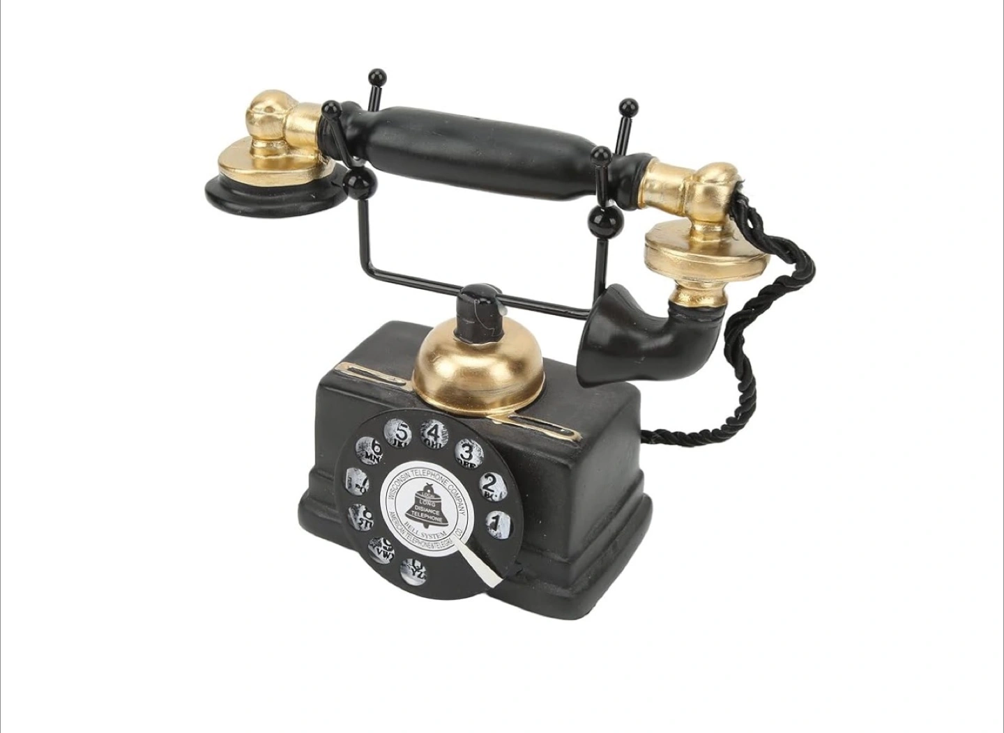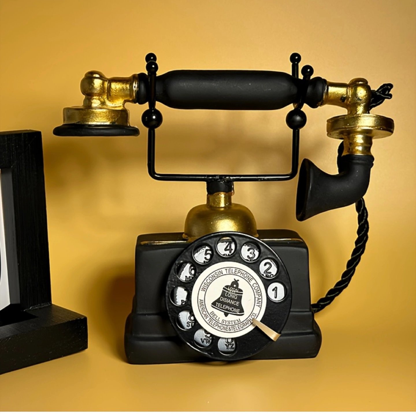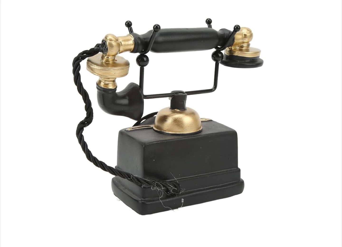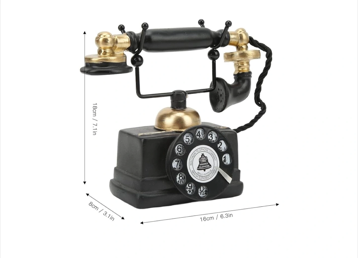248Add a touch of vintage charm to your home with this decorative telephone! It features a classic black and gold design, reminiscent of old-fashioned telephones. It would look great on a desk, shelf, or side table. The approximate dimensions are 18cm (7.1in) tall, 8cm (3.1in) wide, and 16cm (6.3in) long.