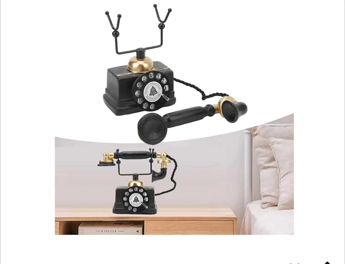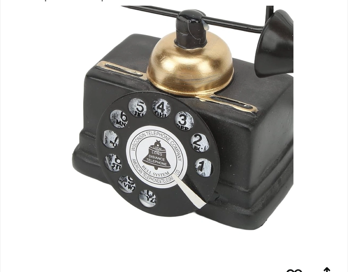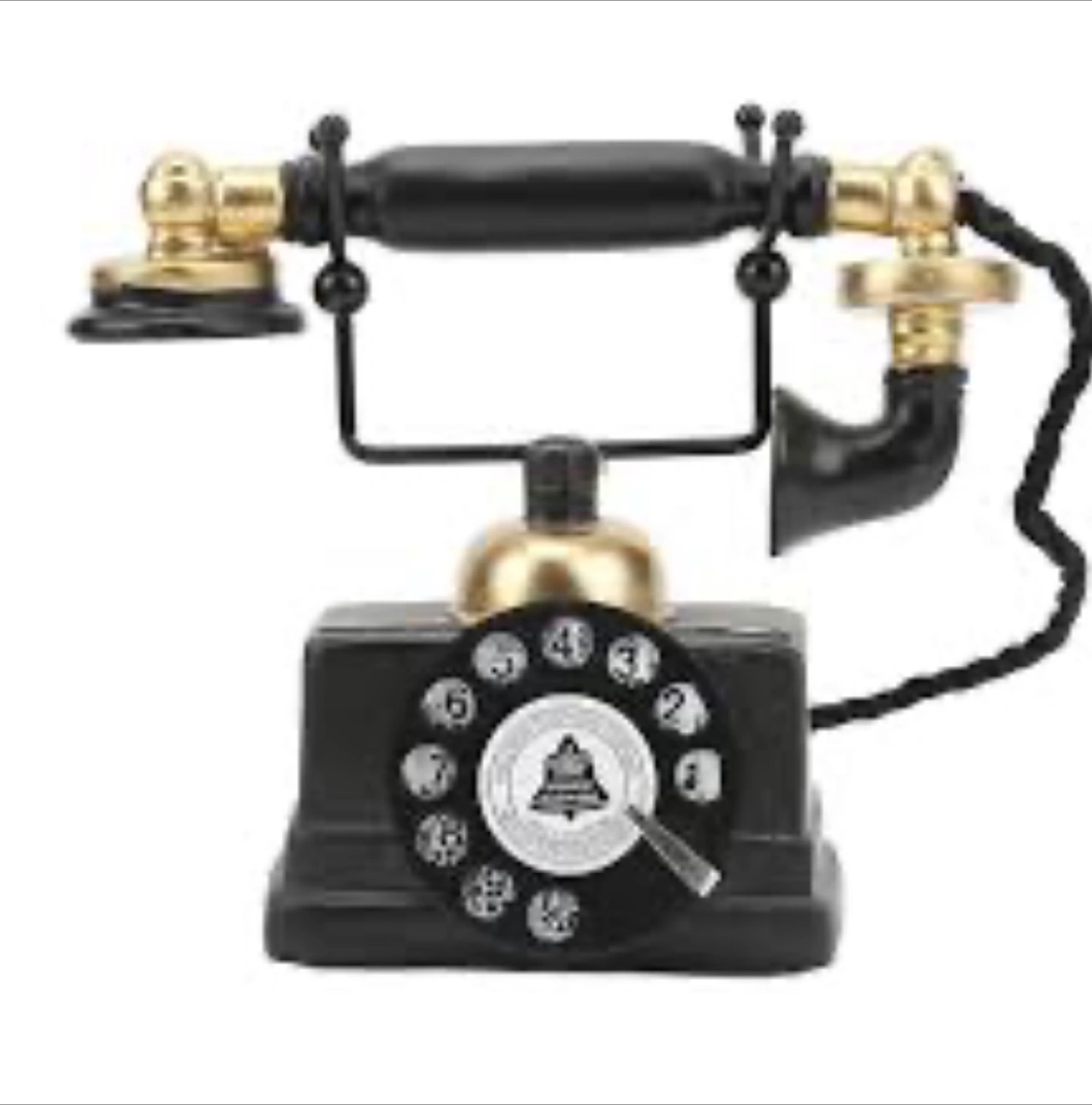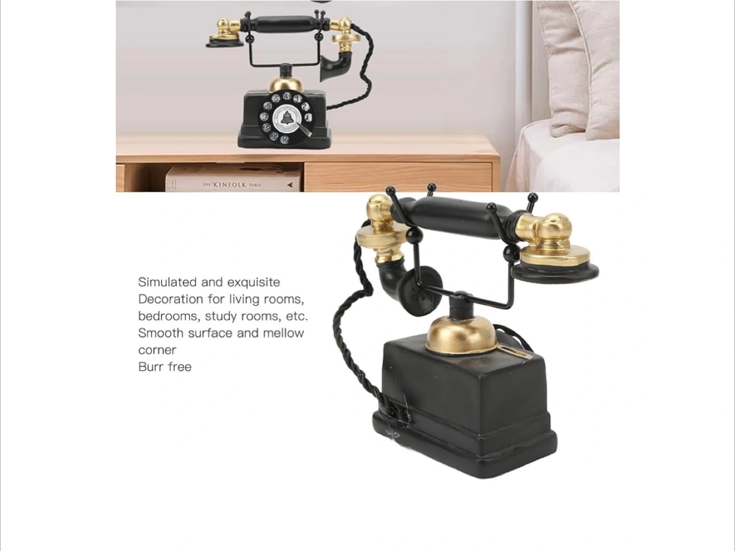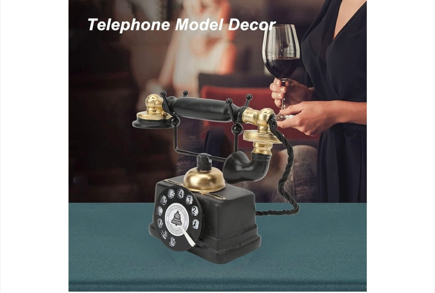 248Add a touch of vintage charm to your home with this decorative telephone! It features a classic black and gold design, reminiscent of old-fashioned telephones. It would look great on a desk, shelf, or side table. The approximate dimensions are 18cm (7.1in) tall, 8cm (3.1in) wide, and 16cm (6.3in) long.