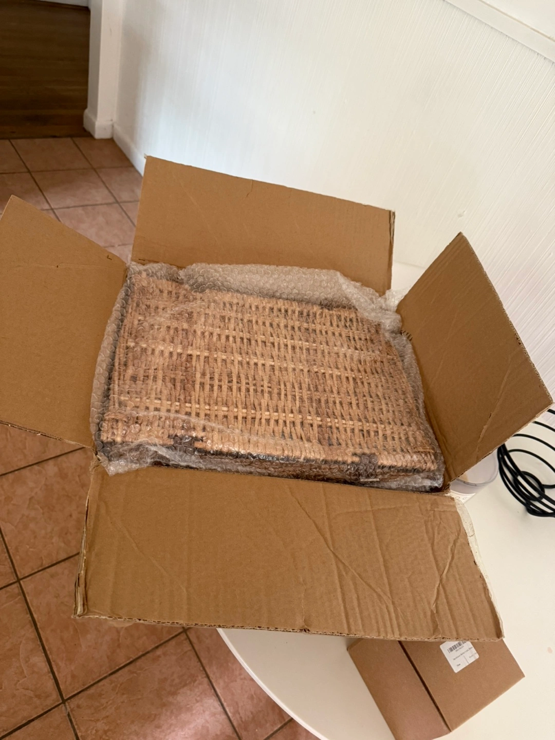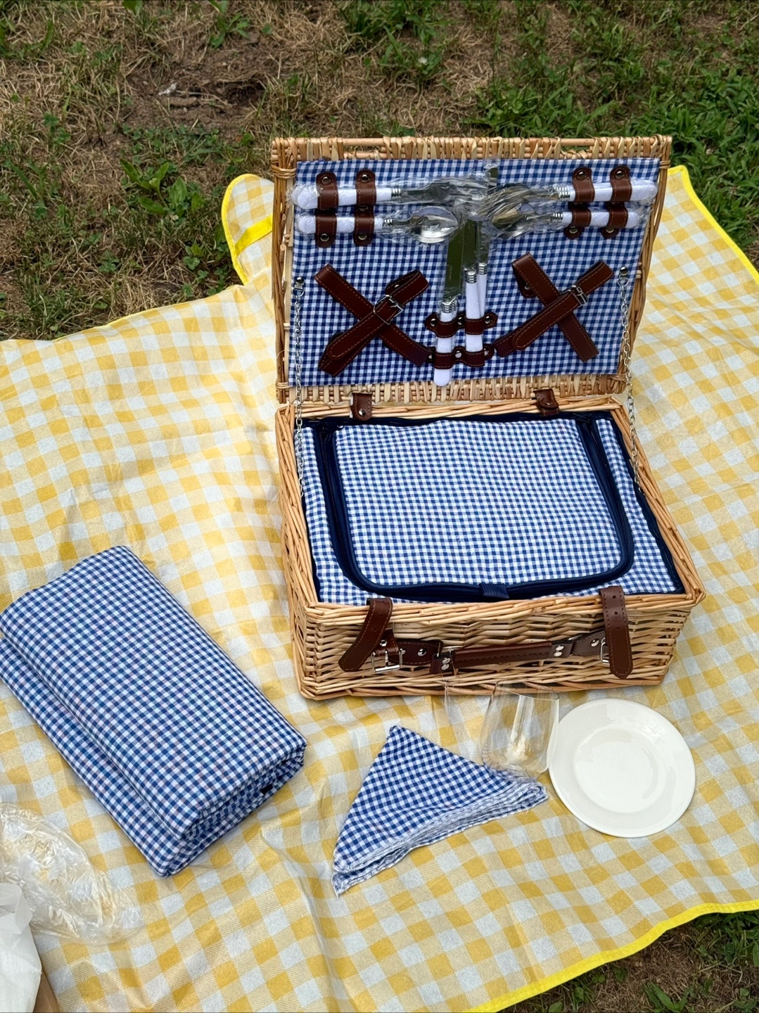 - A charming wicker basket with a blue and white checkered lining