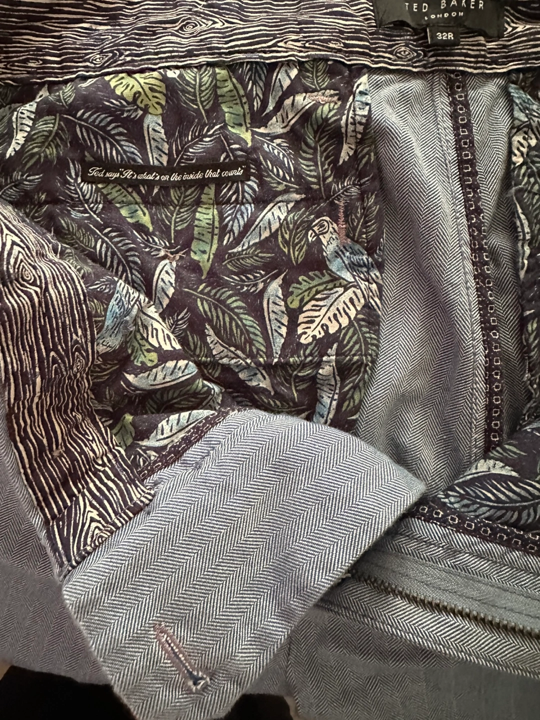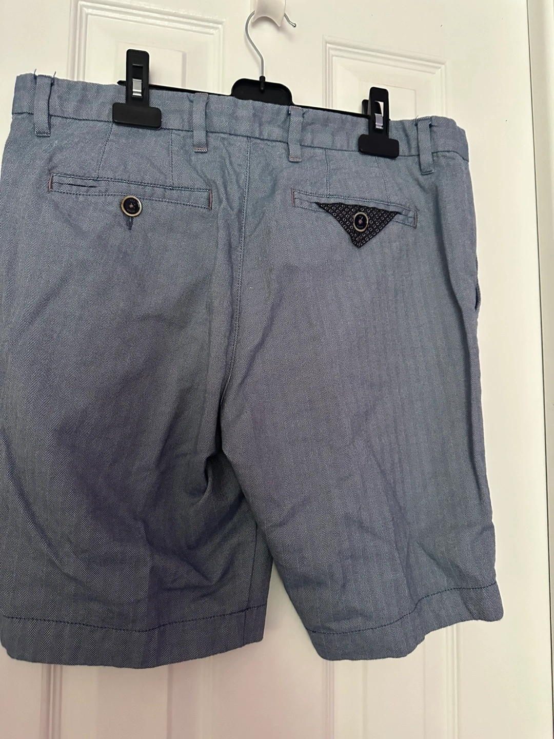 Selling 2 pairs of Ted Baker London shorts in size 32R. One blue & one Navy blue, They feature a unique interior pattern with leaves and a stylish herringbone design on the exterior. Great for a casual, smart look!