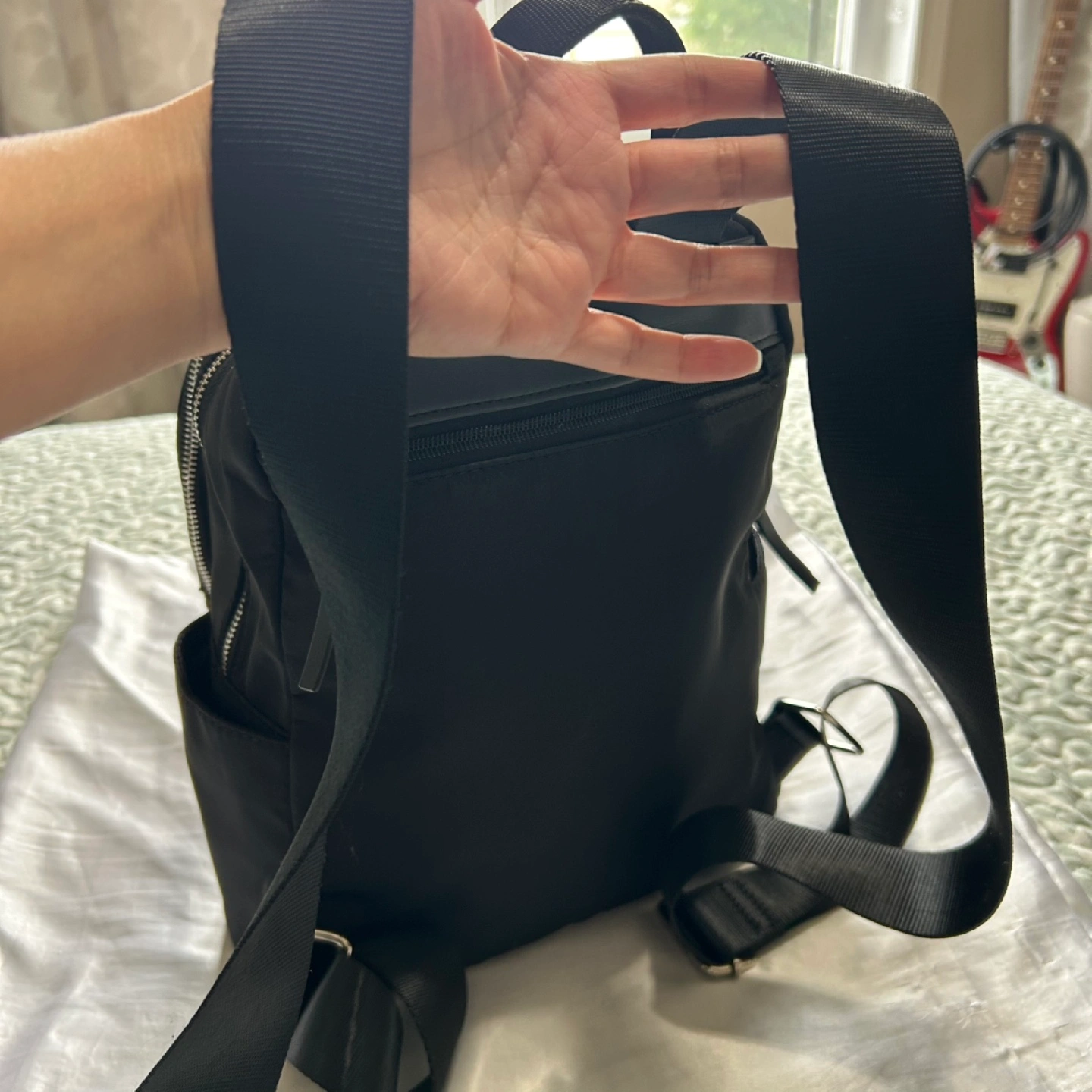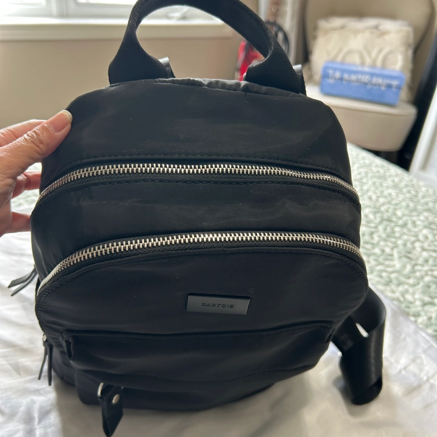 This is a cute black mini backpack by Parfois! It's perfect for carrying your essentials while keeping your hands free. The backpack features adjustable straps and multiple compartments to keep you organized