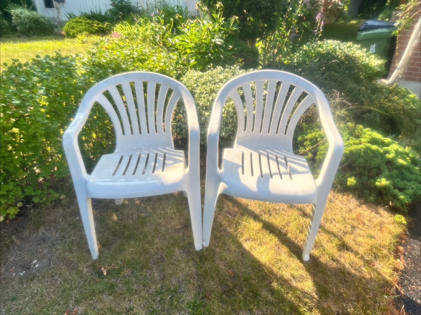 Selling two white plastic outdoor chairs. They're perfect for relaxing in your backyard or on your patio $12 for 2 pcs