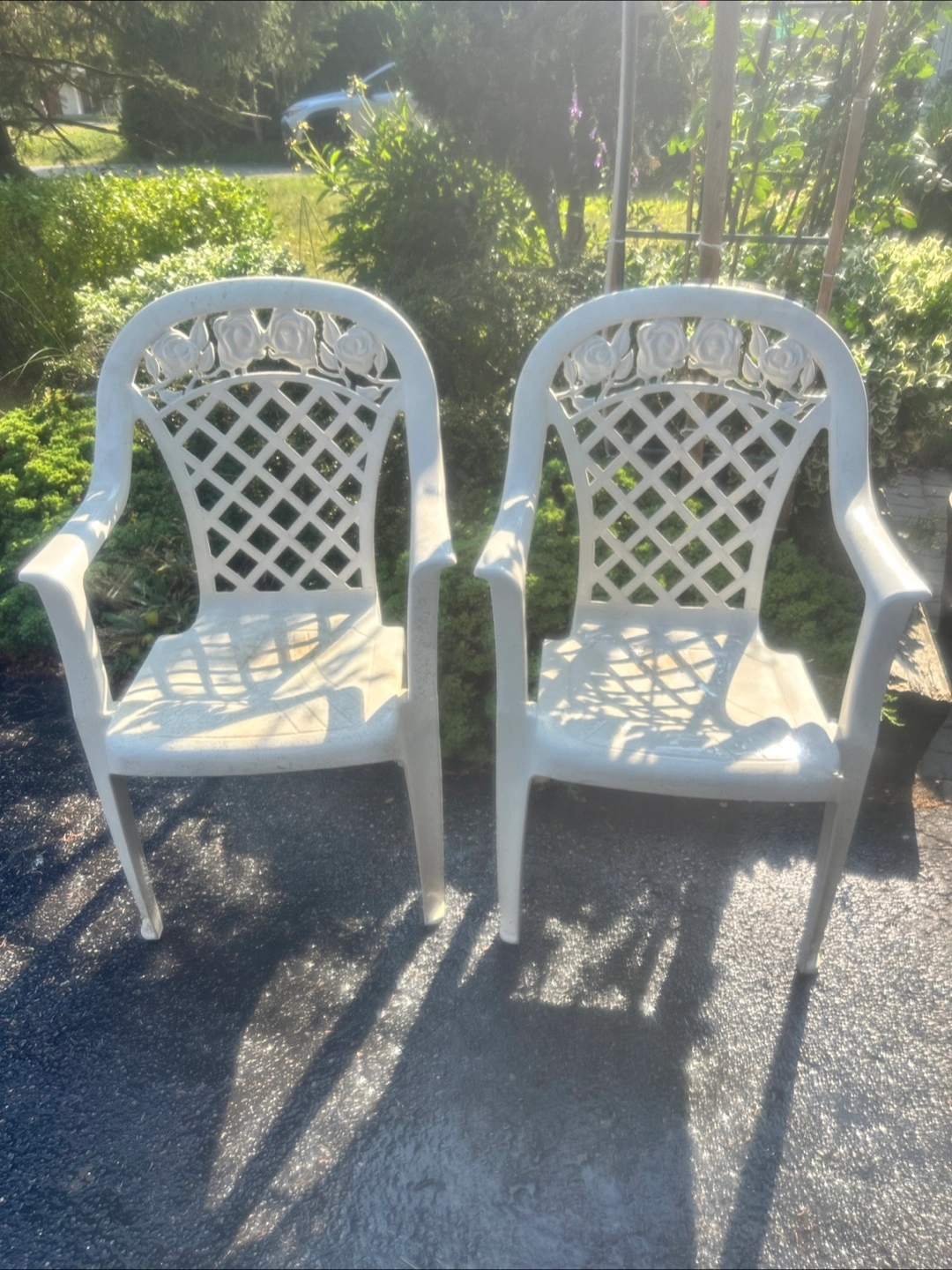 Selling a set of two white plastic outdoor chairs. They have a cute rose design on the back. Perfect for your patio or garden! $20 for 2pcs