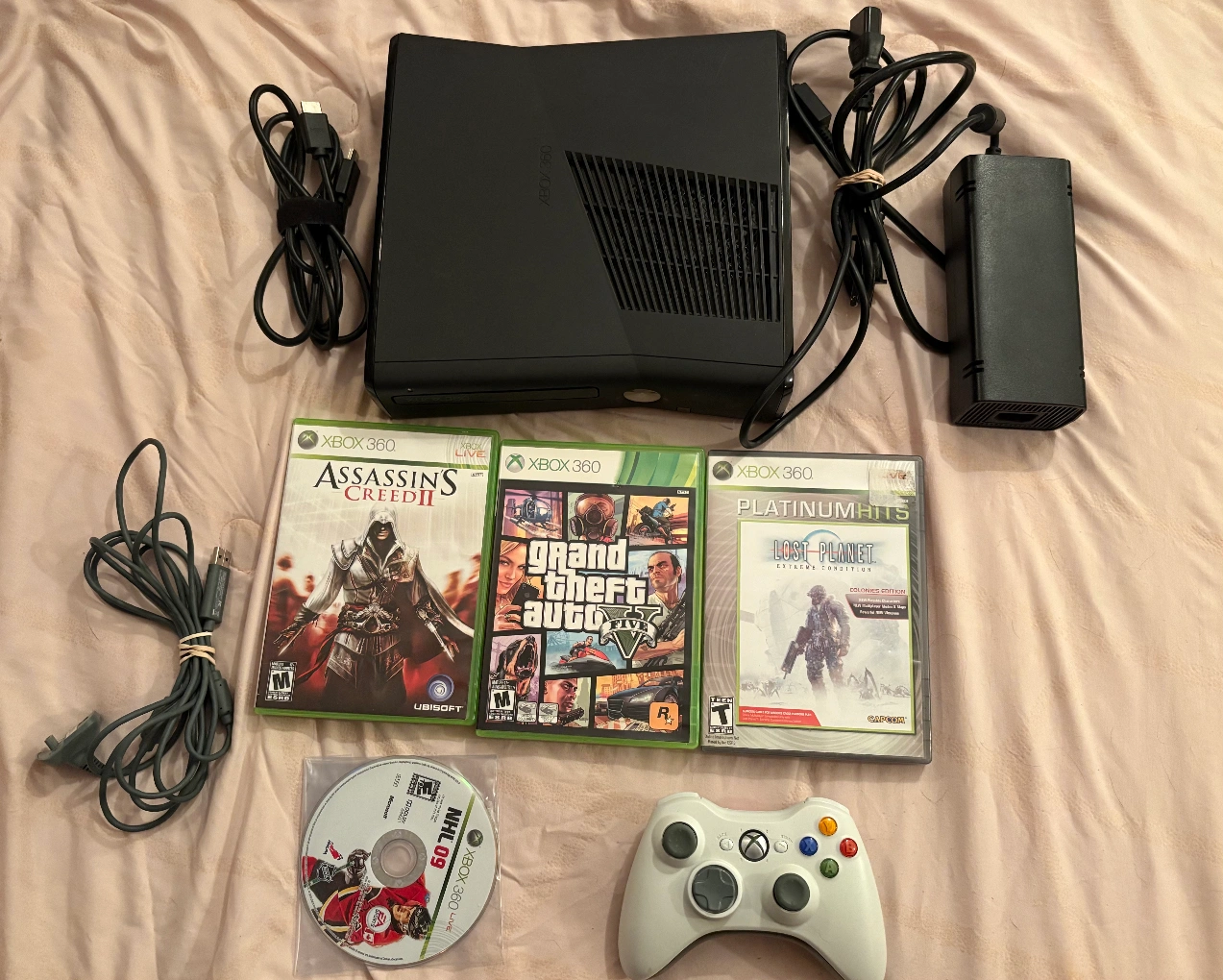 Selling my excellent used condition Xbox 360 Slim! Asking $100 firm! Xbox comes with everything in the pictures! Xbox unfortunately doesn’t come with a hard drive but everything else is included! The power cord block is a bit loud at times but does work perfectly fine! Pick up in Westwood st James! Thanks for checking out my ad! ☺️