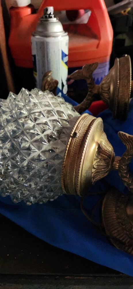 Selling a vintage-style wall sconce with a crystal-like glass shade and gold-coloured metal accents. It has a unique design that would add a touch of elegance to any room!