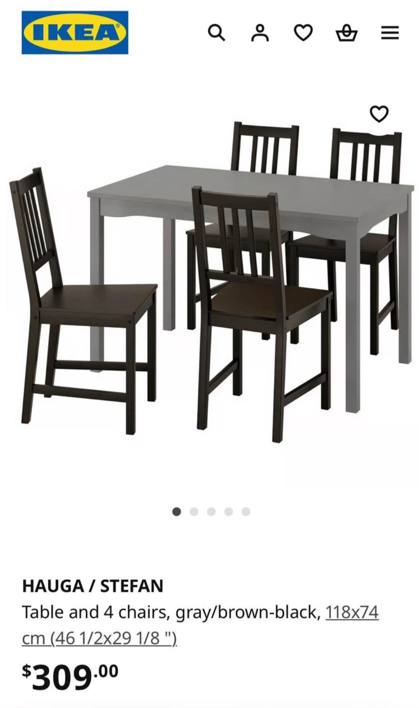 Selling an IKEA Hauga / Stefan table with 4 chairs. The set is gray/brown-black. The table dimensions are 118x74 cm (46 1/2x29 1/8 "). The chair dimensions are 90 cm (35 3/8 ") height, 42 cm (16 1/2 ") seat width, and 40 cm (15 3/4 ") seat depth. Originally bought for $309 PICK UP ONLY! CASH ONLY PLEASE. SERIOUS INQUIRIES ONLY :)
