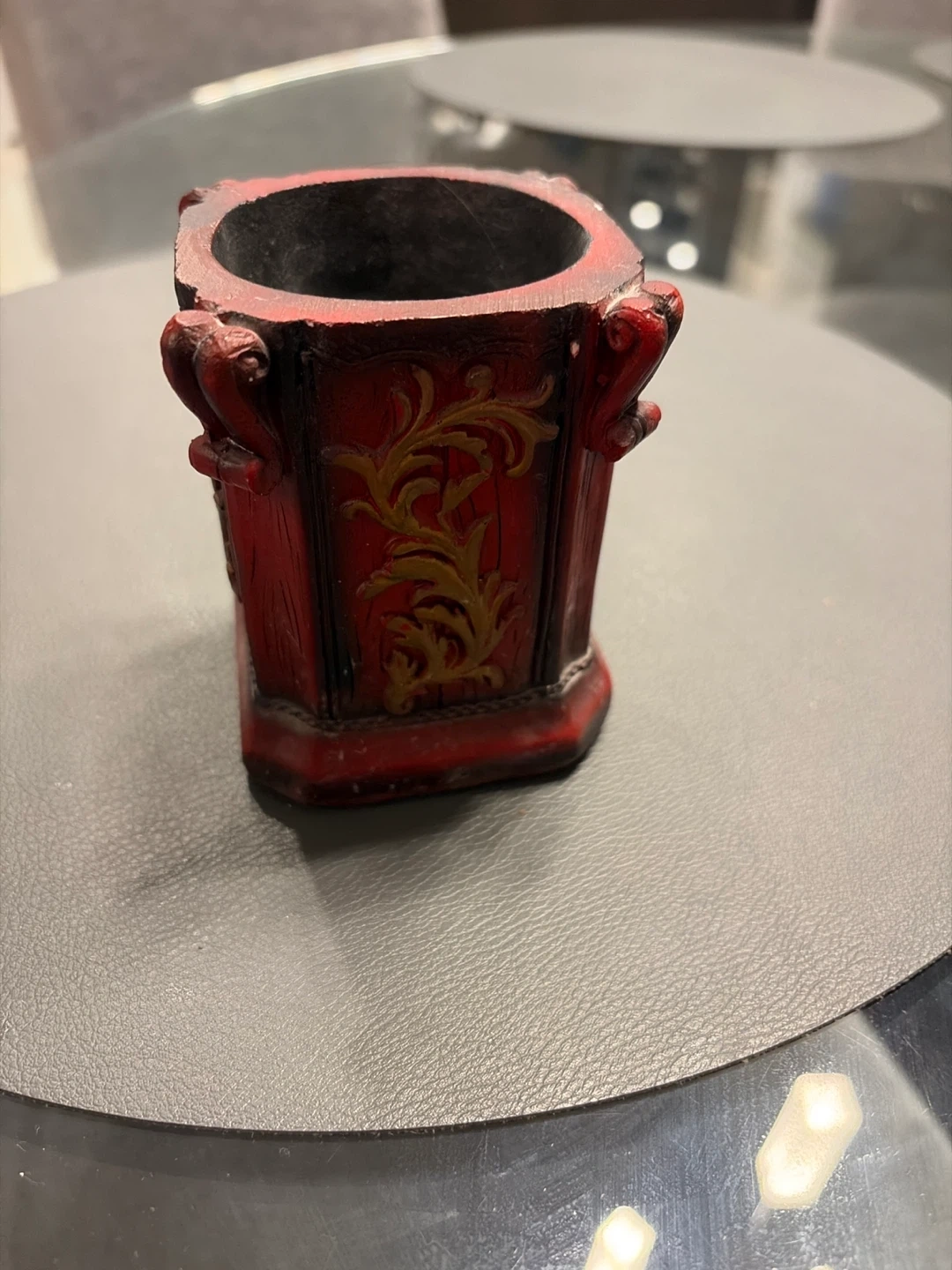 This is a decorative holder with a red and gold ornate design. It's made of a hard material. Its dimensions are approximately 4 inches tall and 3 inches wide at the top.