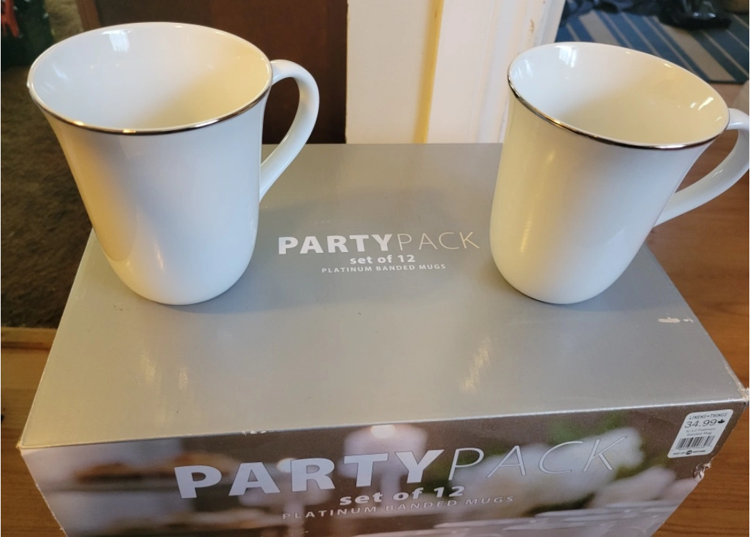 Selling a set of 12 Party Pack platinum banded mugs! They're in excellent condition and come in their original box. The box says they were originally $34.99 at Linens & Things. These mugs would be perfect for a small gathering or to add to your mug collection.