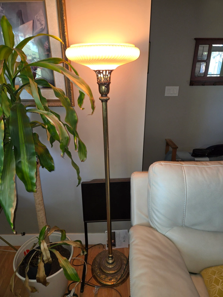 Selling a vintage-style brass floor lamp. It features a beautiful ribbed glass shade that casts a warm glow. The base has an ornate design, adding a touch of elegance to any room. Perfect for adding some character to your living space!