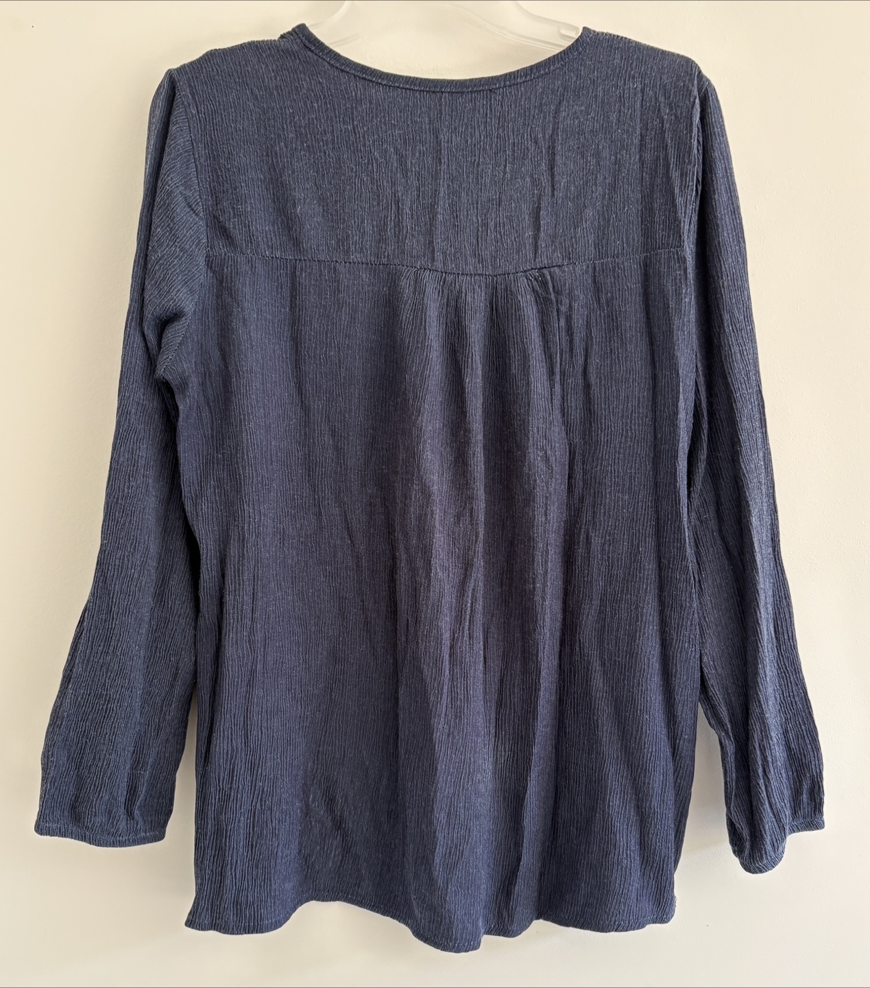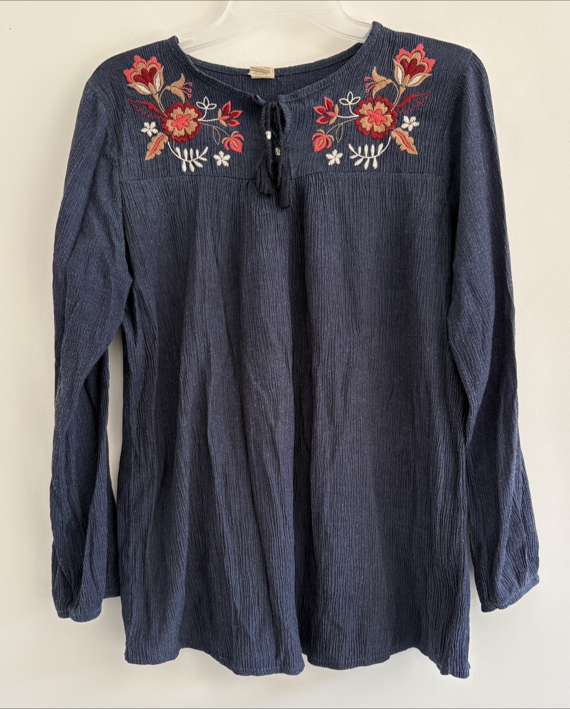 This is a lovely blouse in size medium! It features beautiful floral embroidery around the neckline and a comfortable, relaxed fit. The material has a nice texture, and it's in great condition. Perfect for adding a touch of elegance to your everyday wardrobe.