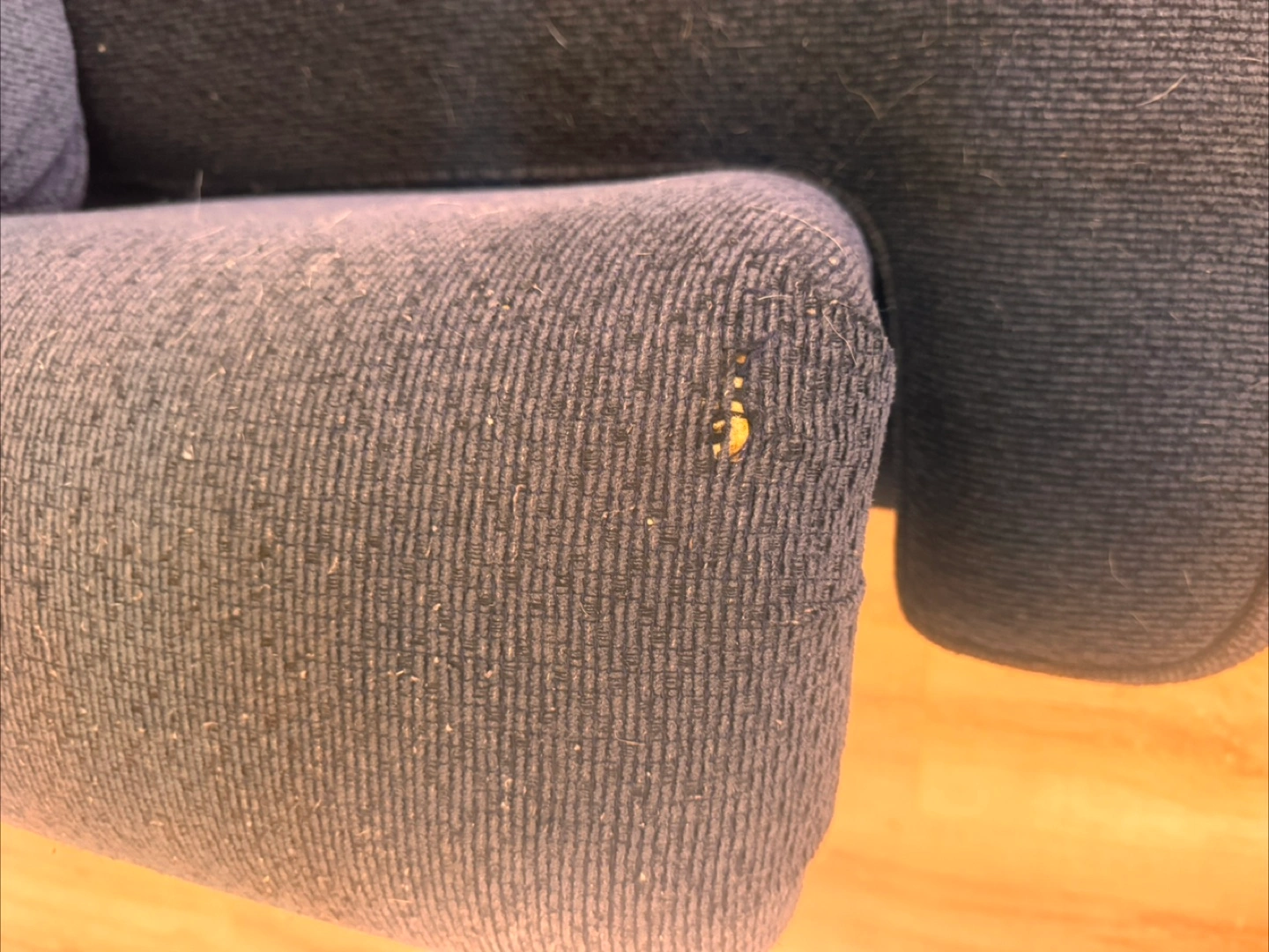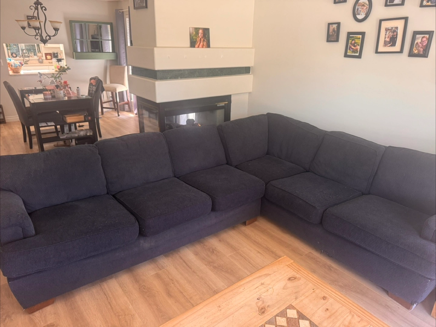 Selling a dark blue sectional sofa. It has some wear and tear, including a small tear on the corner and some damage underneath. Still has lots of life left. Extremely comfy. Comes part into two sections, one of the sections doesn’t have the catcher under it as it got ripped during moving so I cut it out. 200 obo