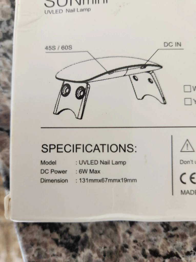 31Selling a brand new SUNmini UVLED Nail Lamp, still in its original box! It's a UVLED Nail Lamp with DC Power of 6W Max. The dimensions are 131mm x 67mm x 19mm
