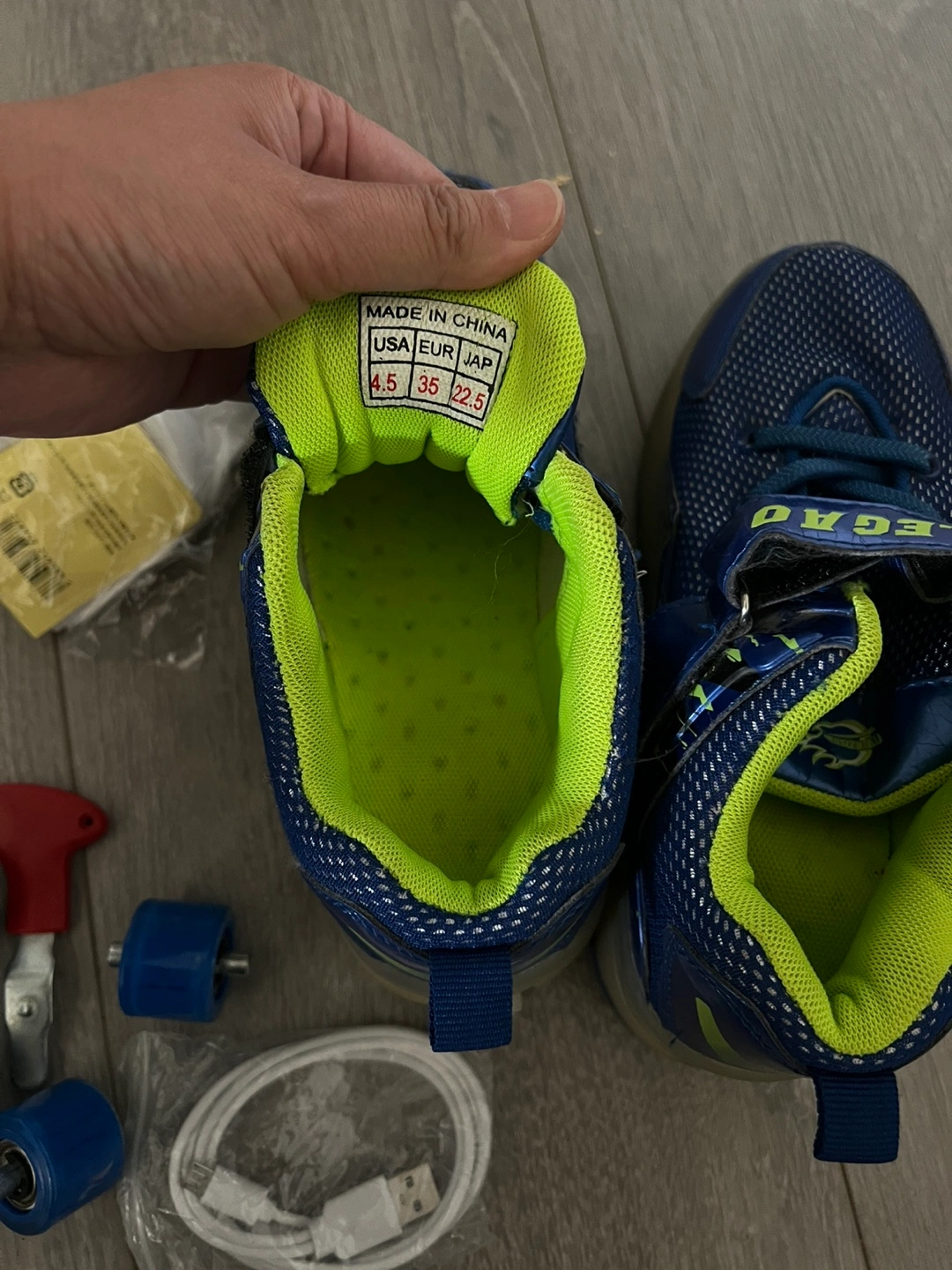Selling a pair of Vegao roller shoes in great condition! They are blue and come with all the accessories you need to switch between regular shoes and roller shoes. The size is 4.5 US