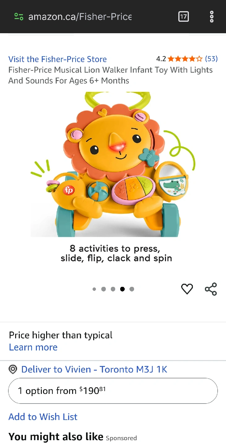 This Fisher-Price Lion Walker is perfect for your little one as they start to explore and take their first steps! It's designed to help babies develop balance and coordination while having fun. The bright colours and playful design will keep your baby entertained as they learn to walk. Like new! 8 different hands-on activities: Light-up nose, musical piano keys, peek-a-boo mirror, flip page, bat-at rollerball ears, clacker-bead toes, spinning dial, slider butterfly Steadies first steps! Lights, sounds & music play as new walkers push lion along Sturdy 4-wheel base Requires 2 AA batteries for lights and sounds, but it will still function as a Walker without them. Two different “grow-with-me” ways for baby to play! With lights, sounds and 8 different busy activities, Fisher-Price Musical Lion Walker encourages younger babies to Sit & Play…batting, spinning, flipping, pressing, clacking, sliding—and playing peek-a-boo in the mirror, too! And when baby’s ready to pull up, stand and walk, this sturdy lion friend bravely steadies baby’s first steps. Lights, sounds and music play as baby pushes lion along. PICK UP ONLY AT KEELE AND FINCH Cash please!