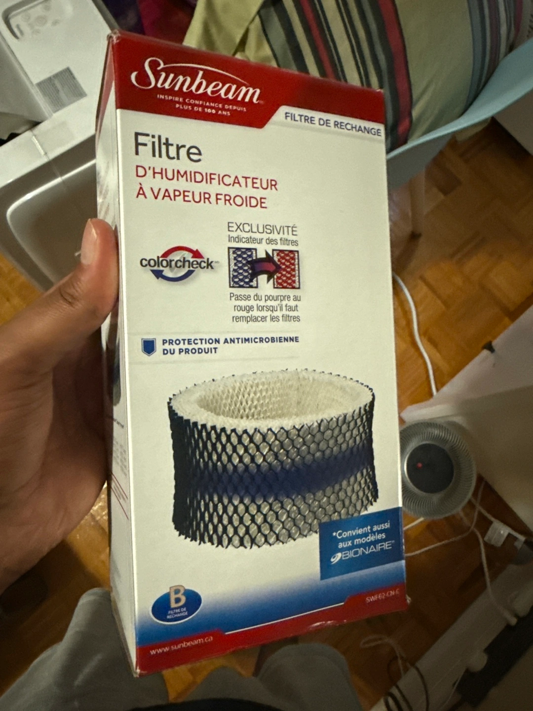 Selling a brand new Sunbeam humidifier filter in its original packaging! This filter is designed for cool mist humidifiers and features ColorCheck technology to indicate when it's time for a replacement. It also provides antimicrobial protection. It is also compatible with Bionaire models.