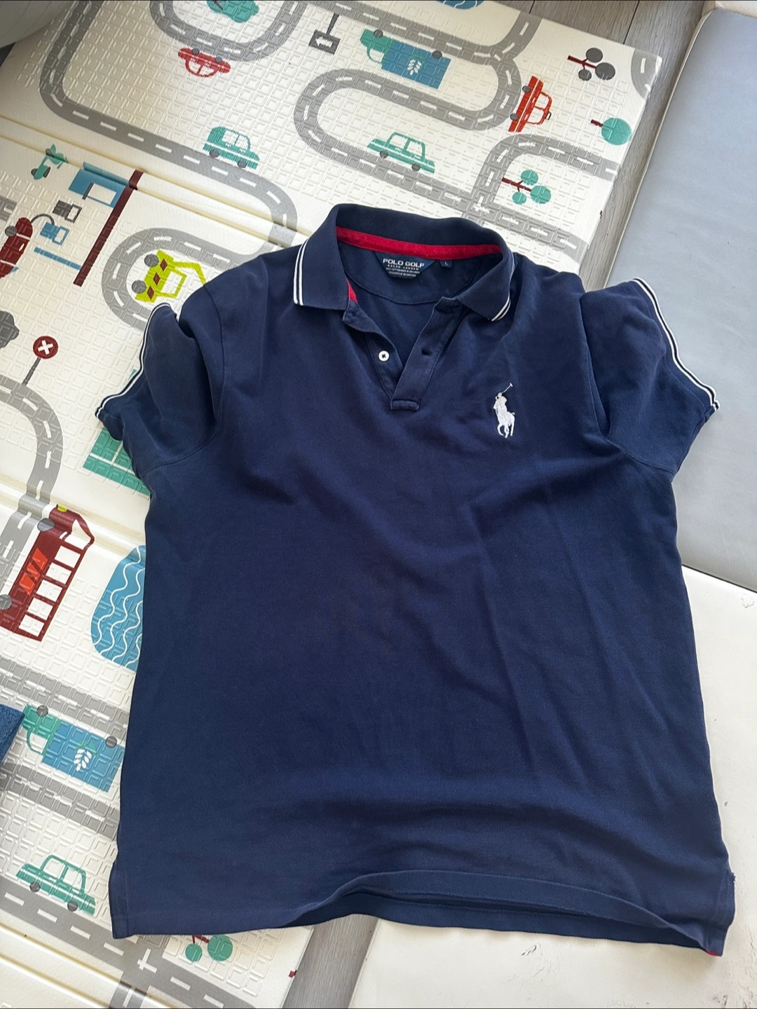 Selling a Ralph Lauren Polo Golf shirt in size L. It's a stylish navy blue colour with a red and white trim on the collar. The shirt is in great condition and ready for a new home!