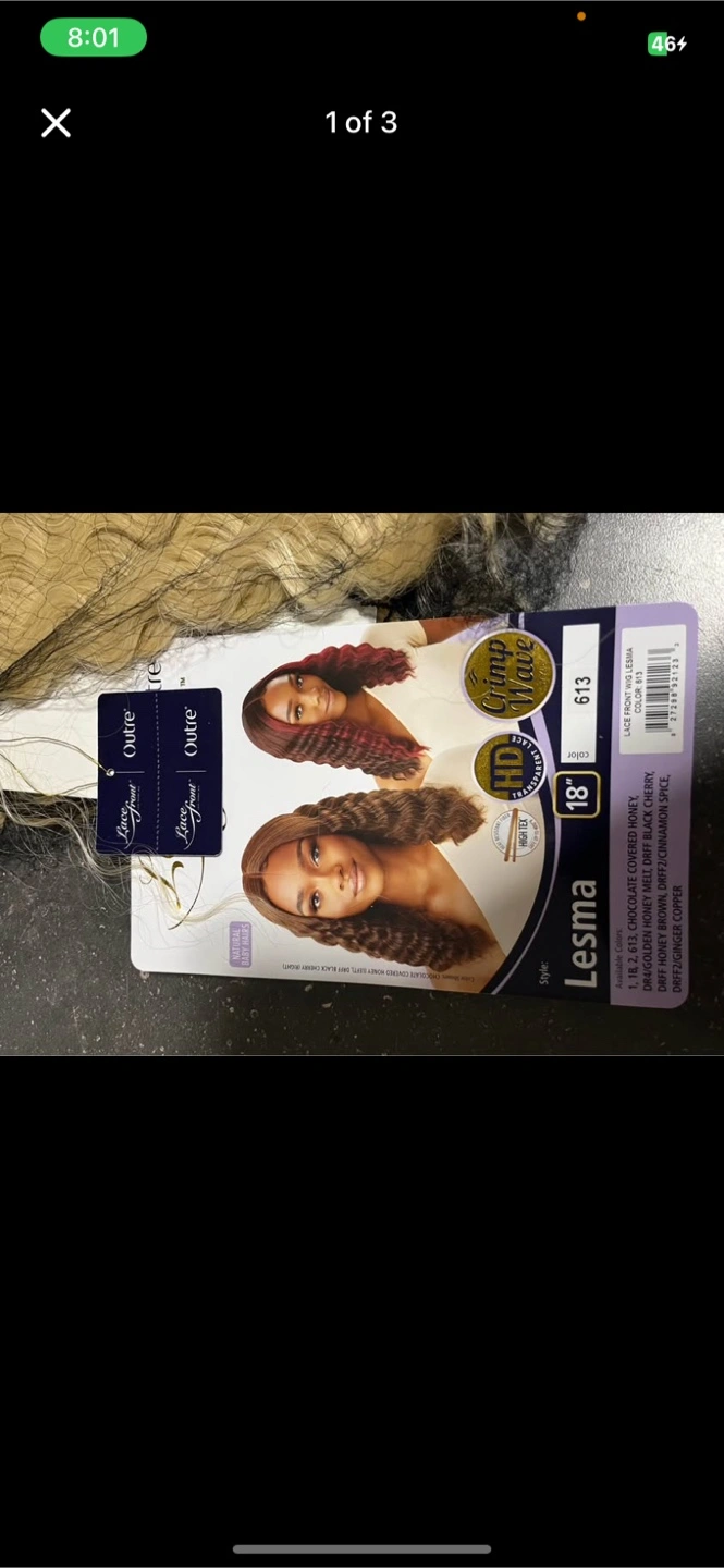 Selling a Lesma lace front wig in colour 613. It's an 18-inch wig with a crimpy wave style. The colour is chocolate covered honey with dark cherry highlights. Perfect for a new look!
