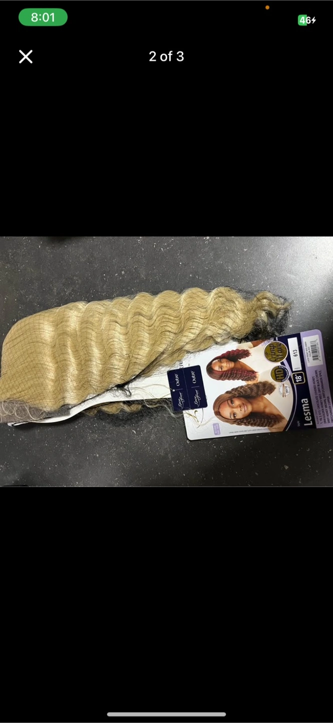 Selling a Lesma lace front wig in colour 613. It's an 18-inch wig with a crimpy wave style. The colour is chocolate covered honey with dark cherry highlights. Perfect for a new look!
