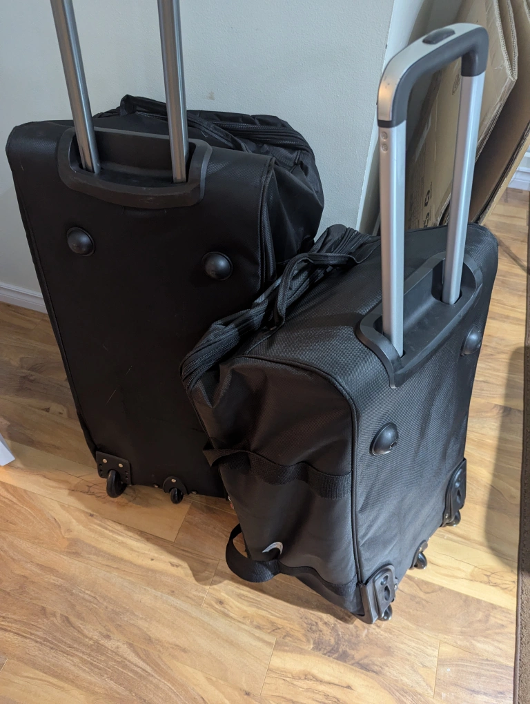 83Selling a black and grey rolling duffel bag. It's in good condition like New and ready for your next trip only one time used It has a retractable handle and wheels for easy transport (1)30L 15W and 14D (2) 27 L 14w and 12D