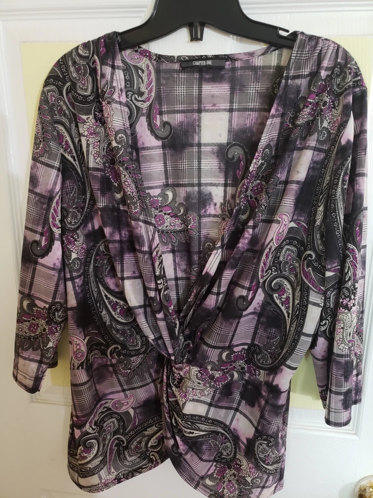 Here's a Chapter One blouse with a unique paisley and plaid pattern! It's got a stylish twist detail at the front. Perfect for adding a bit of flair to your wardrobe!