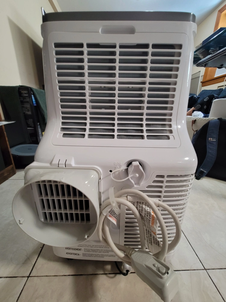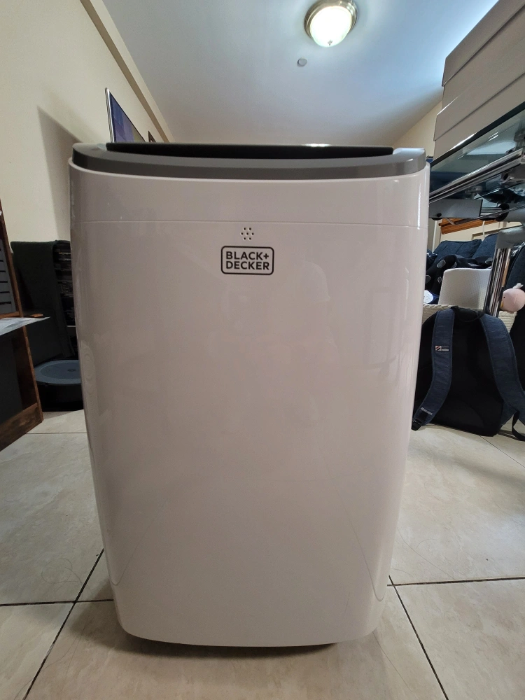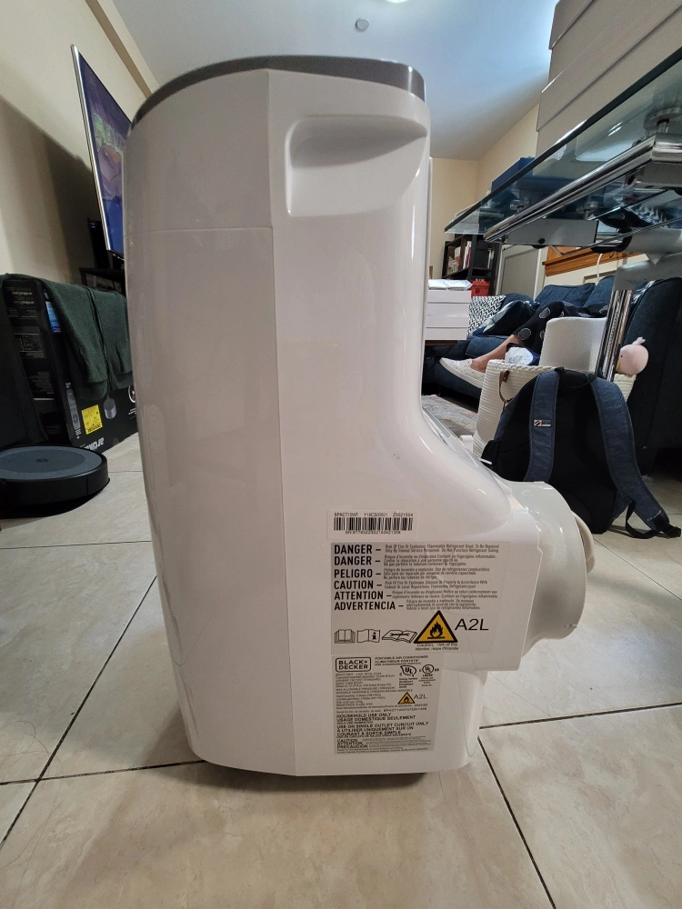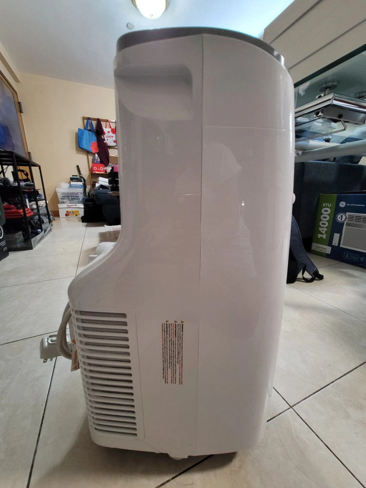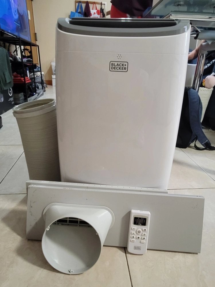 130- 10,000 BTU - Cools up to 450 SQ FT - 25" H x 14" W x 15" L - Weights about 50 LBS Only a year old. Has a black streak on the side but works perfectly fine. It includes: remote control, window brackets, air exhaust hose, hose outlet & inlet, and instruction manual.