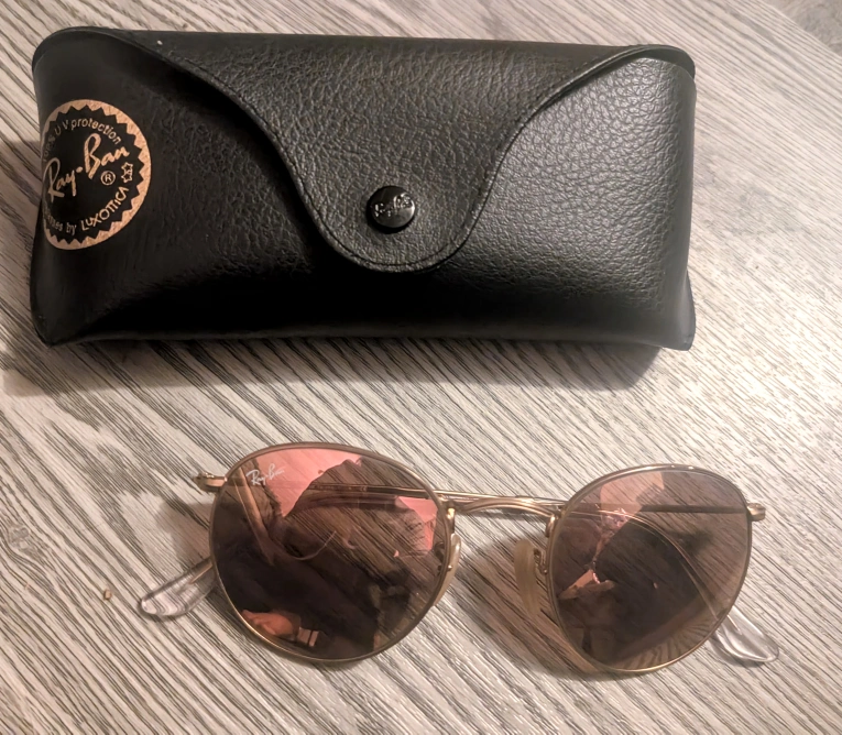 Selling a pair of Ray-Ban RB3447 Round Flash Lenses sunglasses. They're brand new, in great shape and come with the original case. These stylish sunglasses feature round, pink flash lenses and a gold frame. Retail $205, asking $100 OBO.