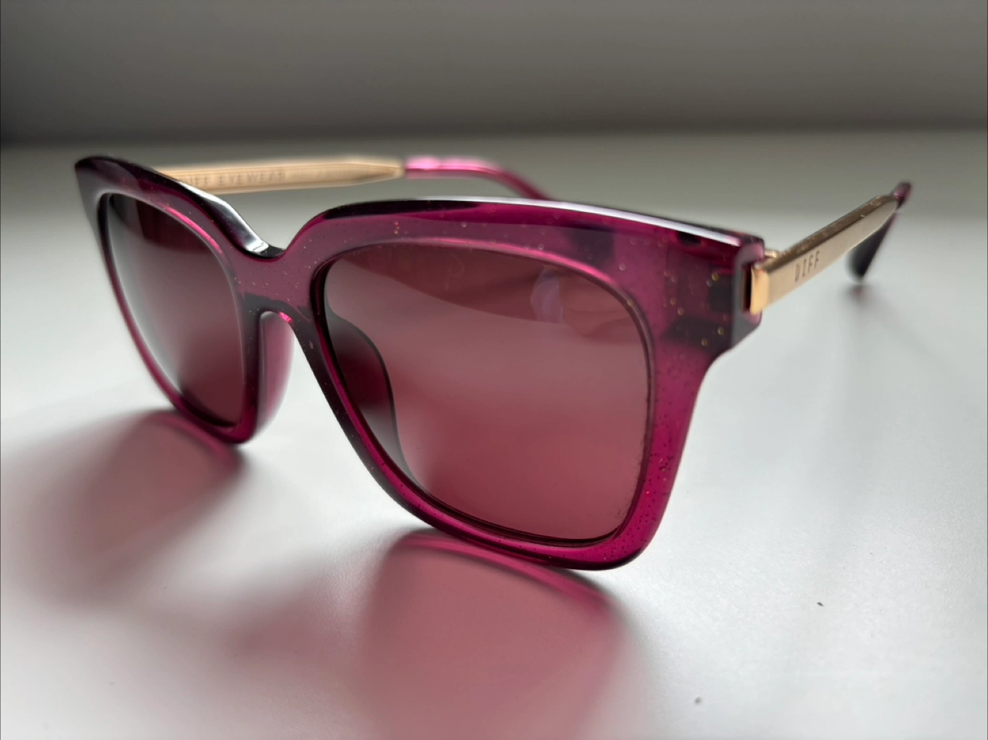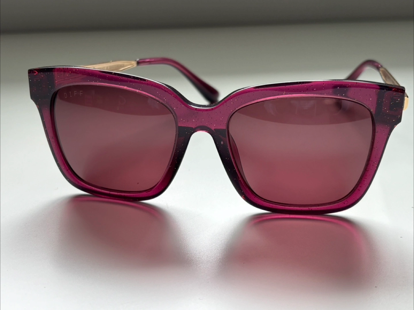 Selling a pair of DIFF Eyewear sunglasses in a lovely fuchsia colour! Comes with the case and cleaning cloth. The frames have glitter in them!