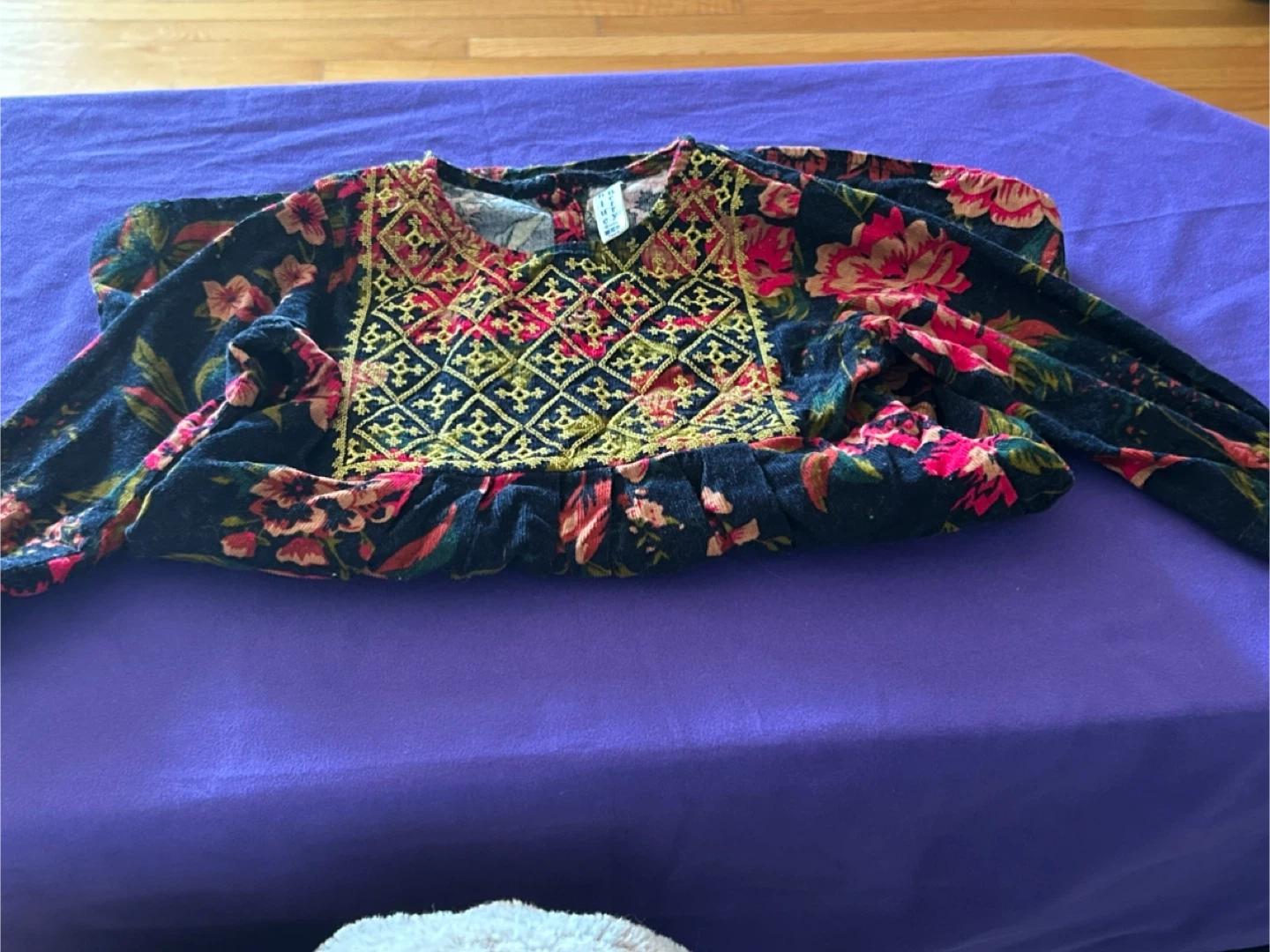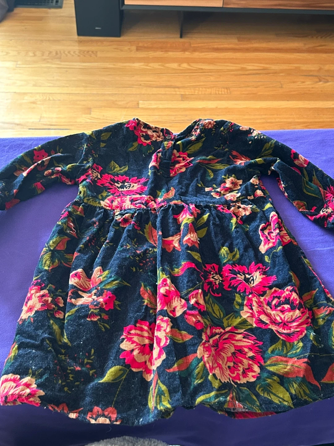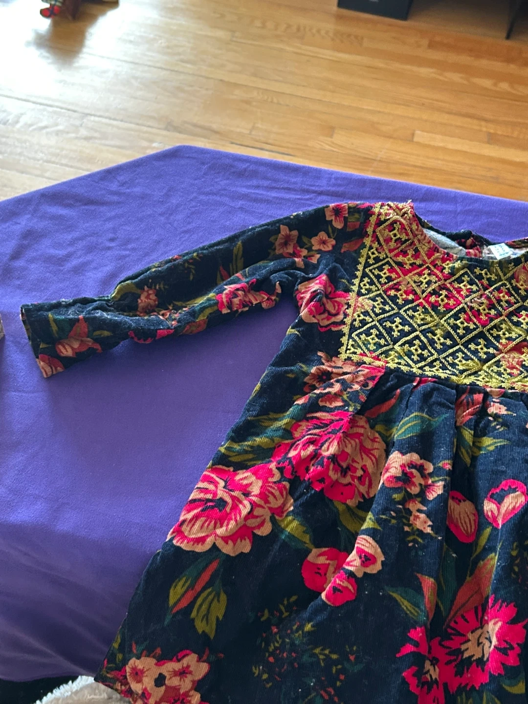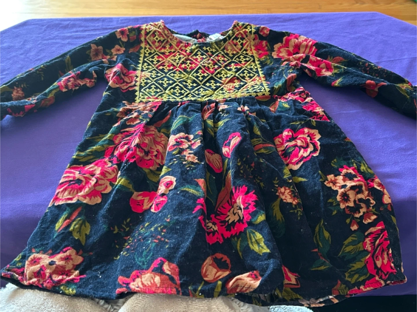 A cute floral corduroy dress perfect for cooler days. It features a detailed embroidered yoke and long sleeves. Made from soft corduroy fabric.