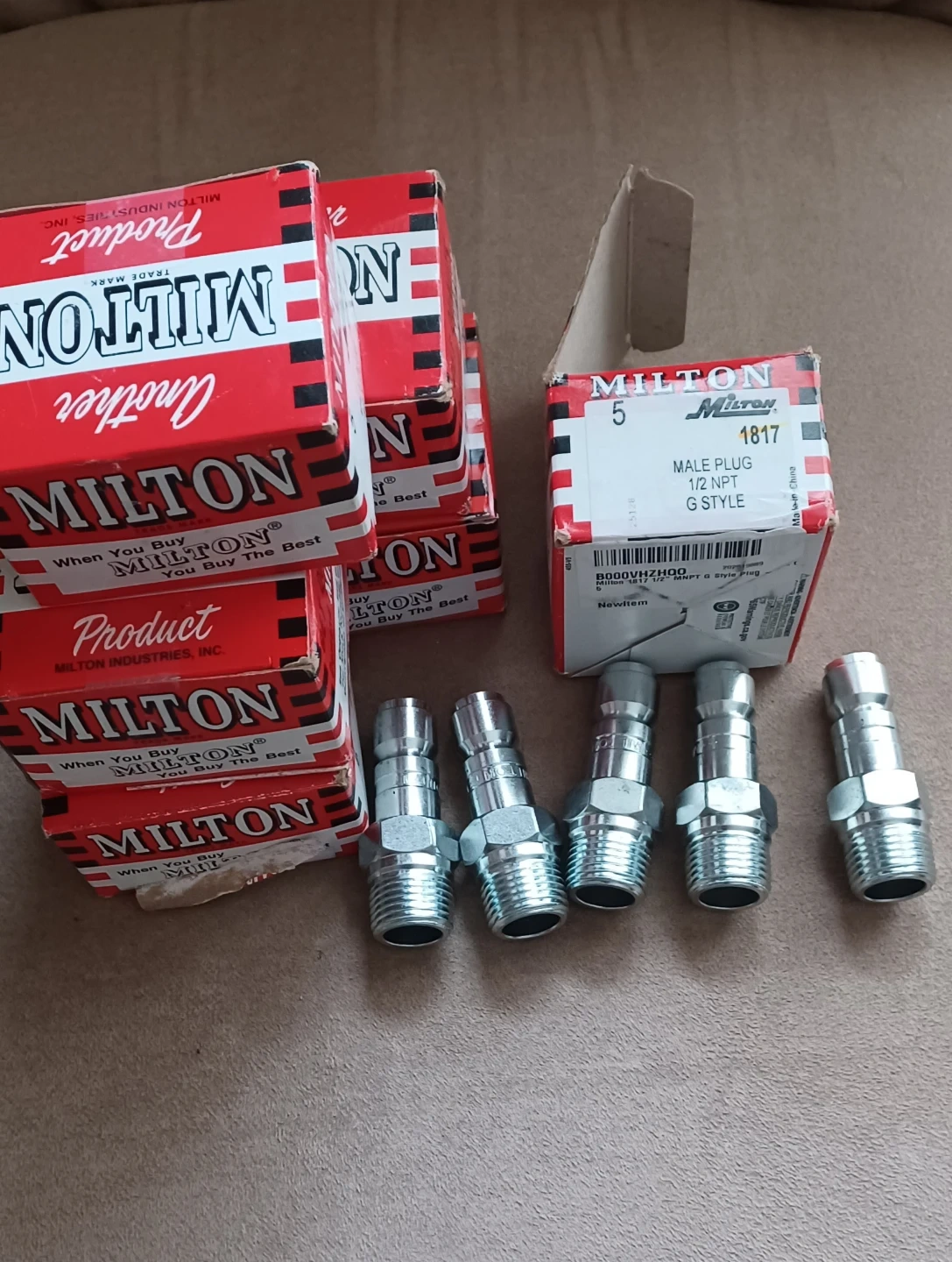 This set includes five Milton male plugs with 1/2" NPT G Style fittings. They're made of durable metal for your air tool needs. These plugs are useful for connecting air hoses and tools. They're great for any workshop.