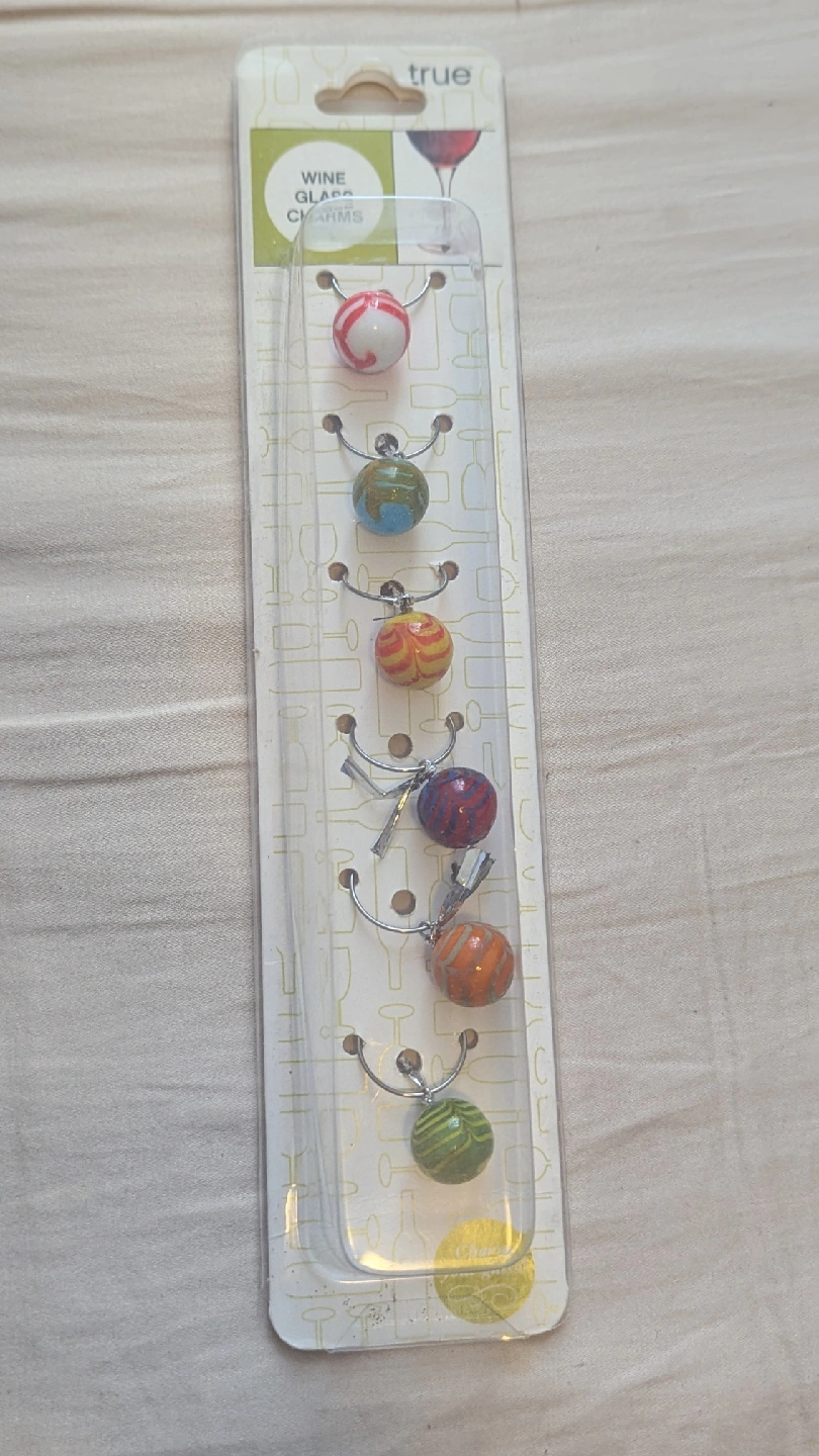I'm selling a brand new set of True wine glass charms! This set comes with 6 charms, each with a different colored marble design. They're perfect for adding a touch of fun to your next get-together and making sure everyone keeps track of their glass