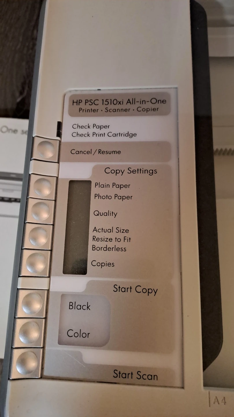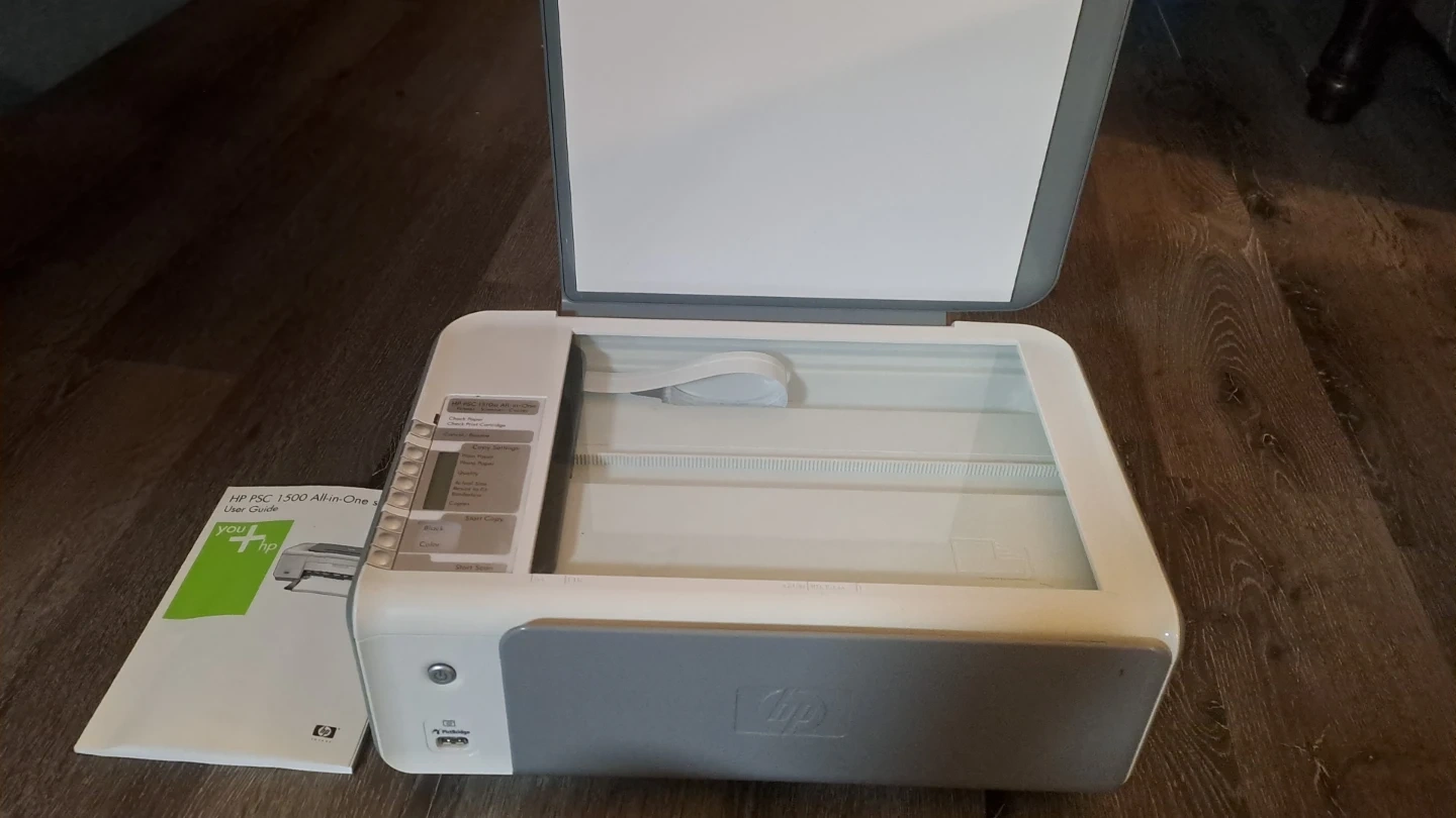 This HP PSC 1510xi is an all-in-one unit that functions as a printer, scanner, and copier. It features a PictBridge USB port for direct photo printing. Includes the user guide.