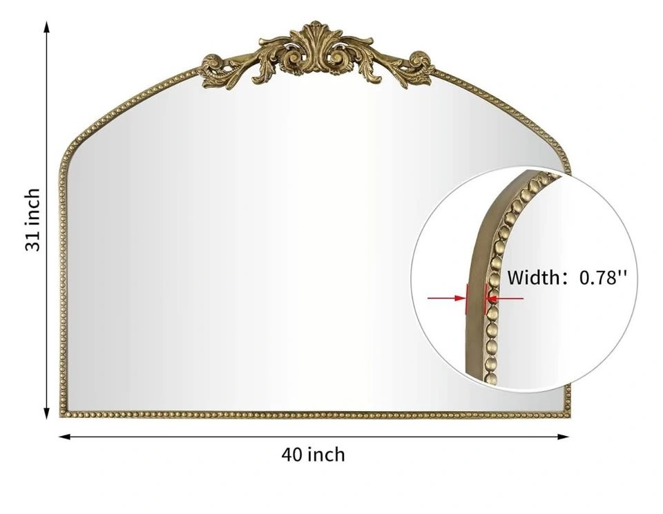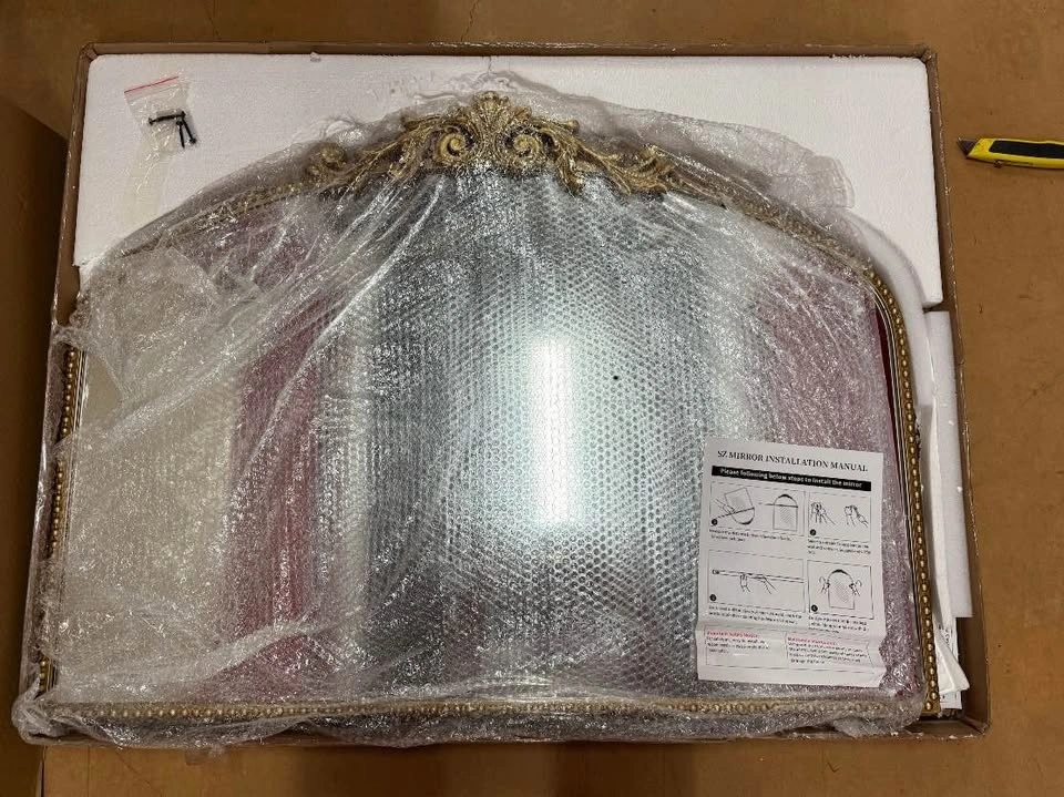 Brand new. This wall mirror features an ornate baroque style metal frame with an elegant wreath overlay and arch, adding traditional charm to your home decor. It makes an elegant centerpiece or display accent. The 40 x 31 inch vintage mirror frame is made of high-quality metal with cast iron vintage engraved patterns, hand-polished for a smooth finish. The metal frame is strong, rust-resistant, and resists warping. The baroque arched mirror uses high-definition, explosion-proof glass for clear, undistorted reflections, helping to illuminate the room and visually expand the space. Sturdy metal hooks and mounting hardware are included for convenient hanging. You can also place the mirror on a dresser, fireplace, or console. (NOTE: The mirror is heavy and needs to be installed with your family to ensure safety). This mirror is perfect as an accent piece or as part of a gallery wall. It can be used as an antique gold bathroom mirror, vanity mirror, entry mirror, or hallway mirror. It also makes a great gift for housewarming, birthdays, and more.