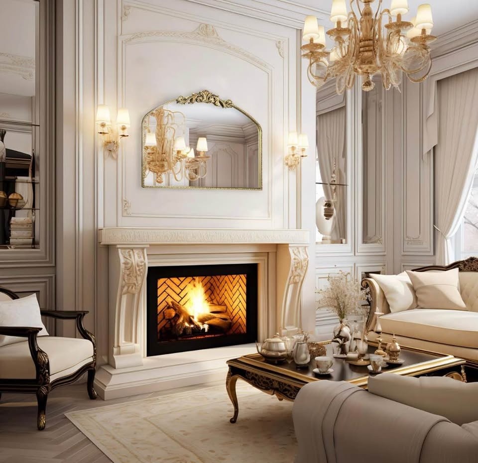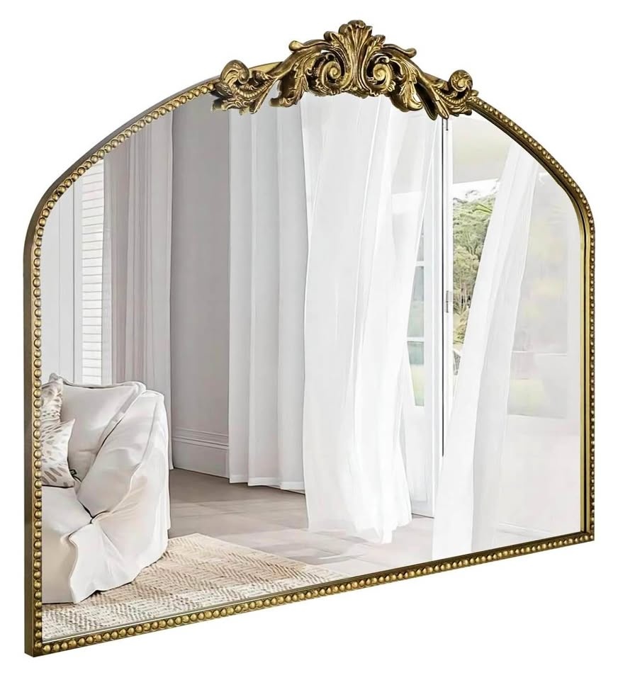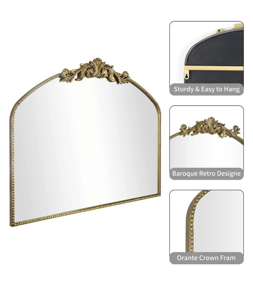 Brand new. This wall mirror features an ornate baroque style metal frame with an elegant wreath overlay and arch, adding traditional charm to your home decor. It makes an elegant centerpiece or display accent. The 40 x 31 inch vintage mirror frame is made of high-quality metal with cast iron vintage engraved patterns, hand-polished for a smooth finish. The metal frame is strong, rust-resistant, and resists warping. The baroque arched mirror uses high-definition, explosion-proof glass for clear, undistorted reflections, helping to illuminate the room and visually expand the space. Sturdy metal hooks and mounting hardware are included for convenient hanging. You can also place the mirror on a dresser, fireplace, or console. (NOTE: The mirror is heavy and needs to be installed with your family to ensure safety). This mirror is perfect as an accent piece or as part of a gallery wall. It can be used as an antique gold bathroom mirror, vanity mirror, entry mirror, or hallway mirror. It also makes a great gift for housewarming, birthdays, and more.