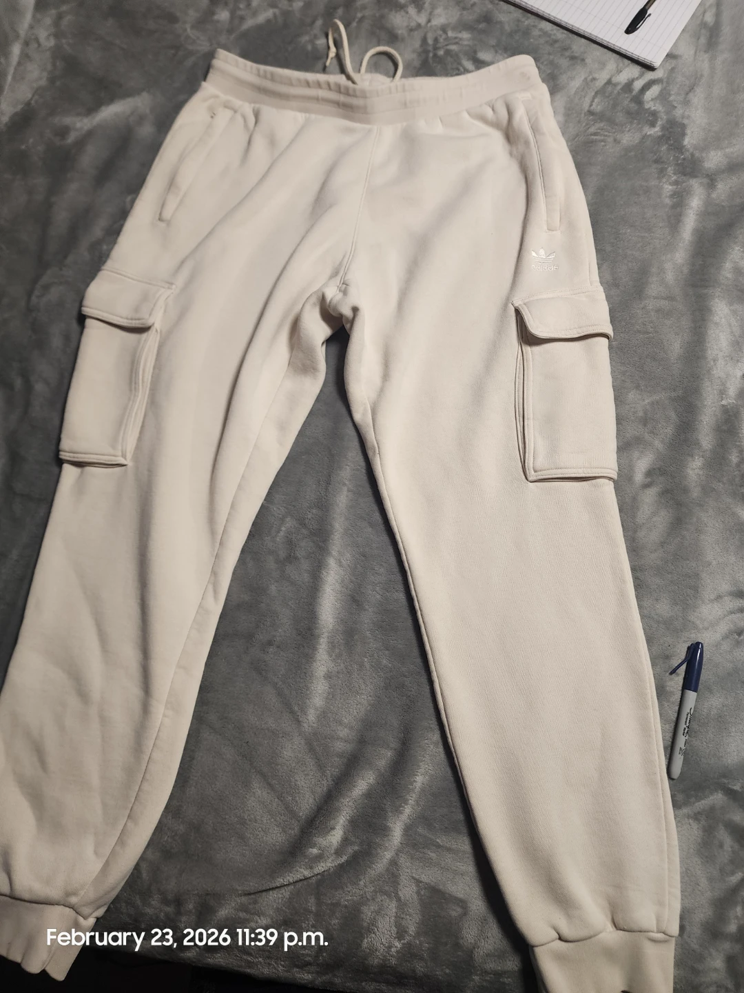These are light beige Adidas sweatpants with cargo pockets. They're made from a soft fabric and feature an elastic waistband with a drawstring. Great for casual wear!