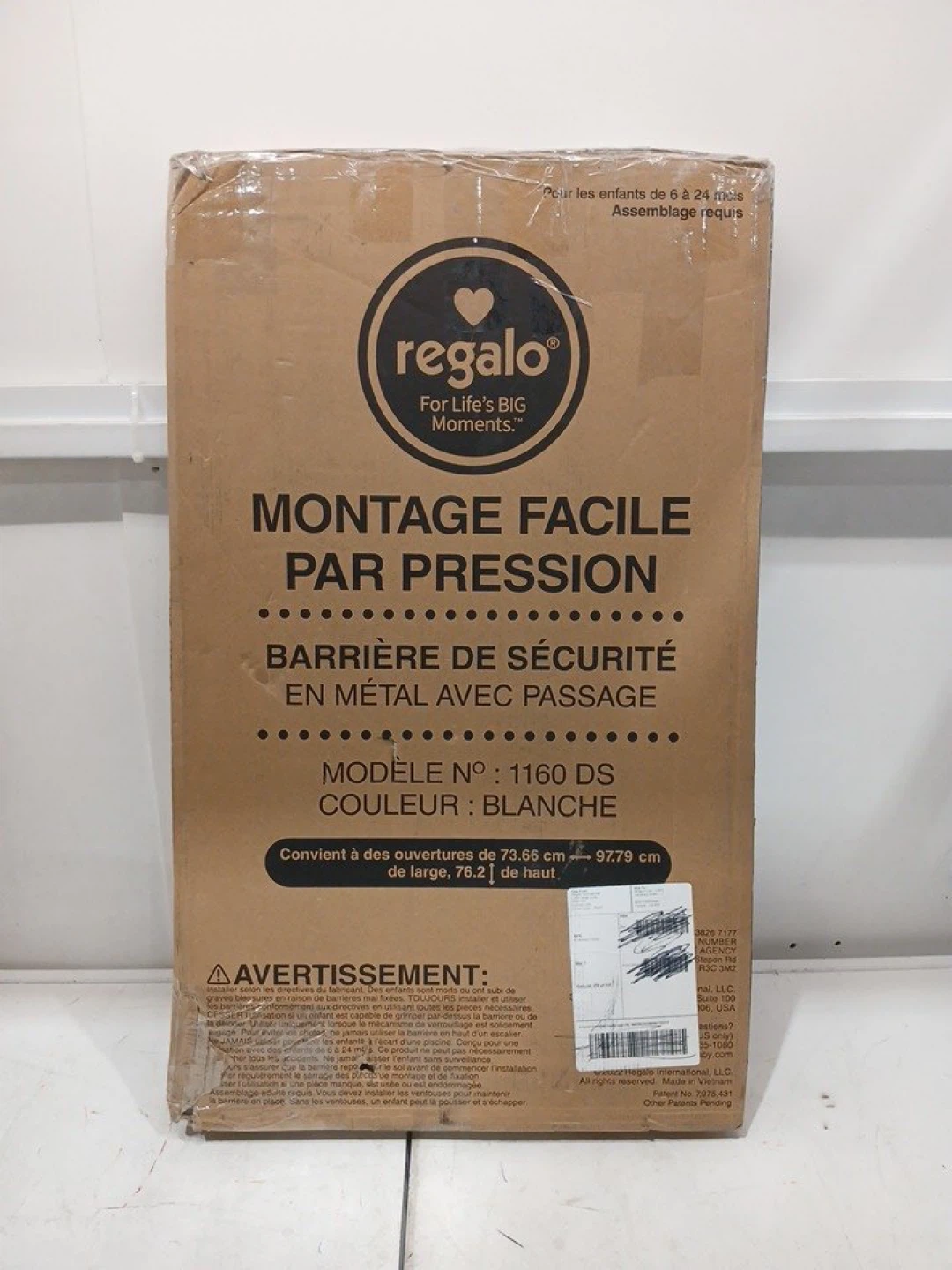 This is a white Regalo Easy Step pressure-mounted safety gate. It's suitable for openings from 73.66 cm to 97.79 cm wide. It fits openings of large size, 76.2 cm in height.